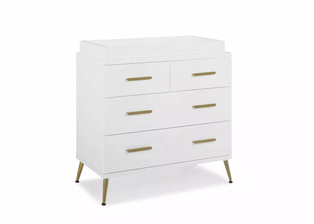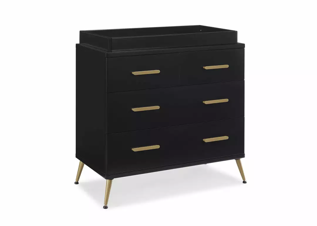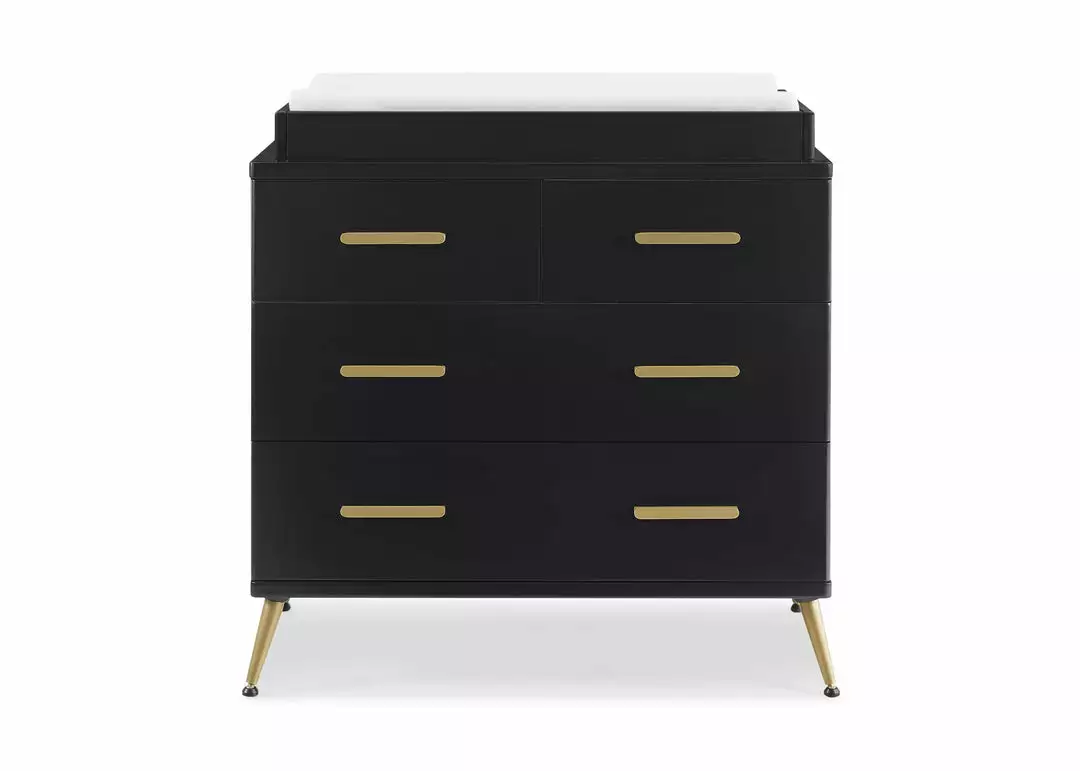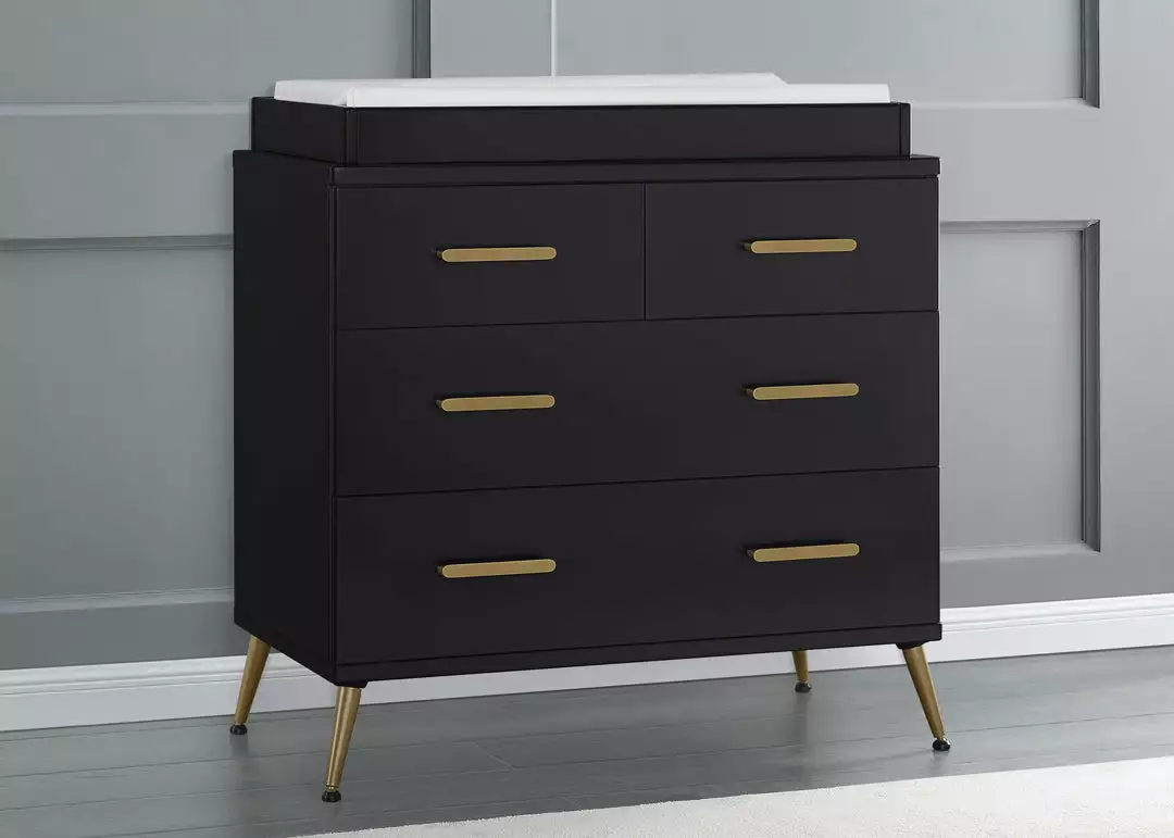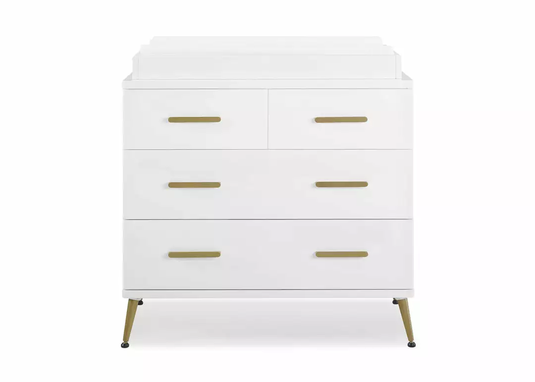 The Sloane 4 Drawer Dresser with Changing Top by Delta Children is the ultimate piece of kidsâ furniture. Sleek and modern, it boasts a mixed material design with bronze splayed feet and drawer handles that make it elevated enough for your master bedroom. But this dresser is more than just fashionableâit’s super functional, too. It features four spacious drawers for ample clothing storage and includes a removable changing top that creates the perfect space for diaper changing. Remove the changing top to create a more grown-up space later on. Pair this dresser with other pieces in the Delta Children Sloane Collection for a coordinated look.