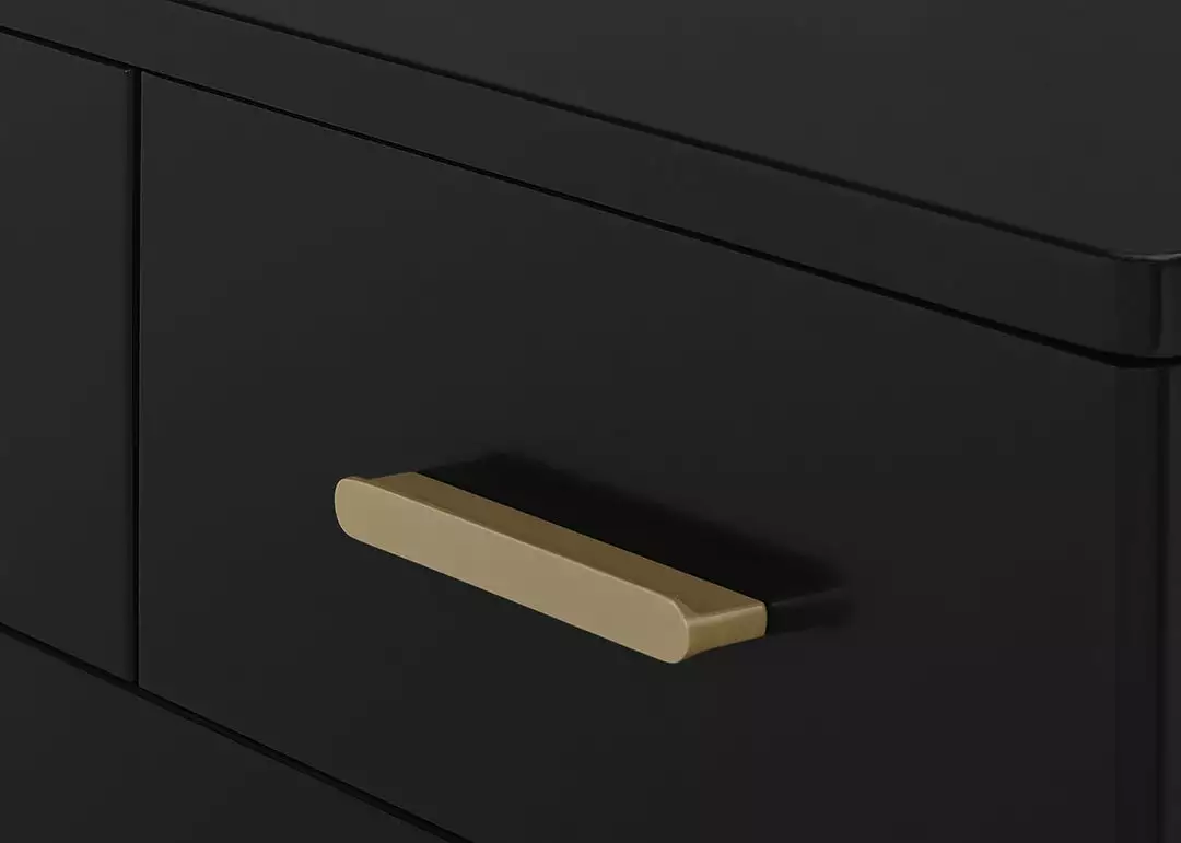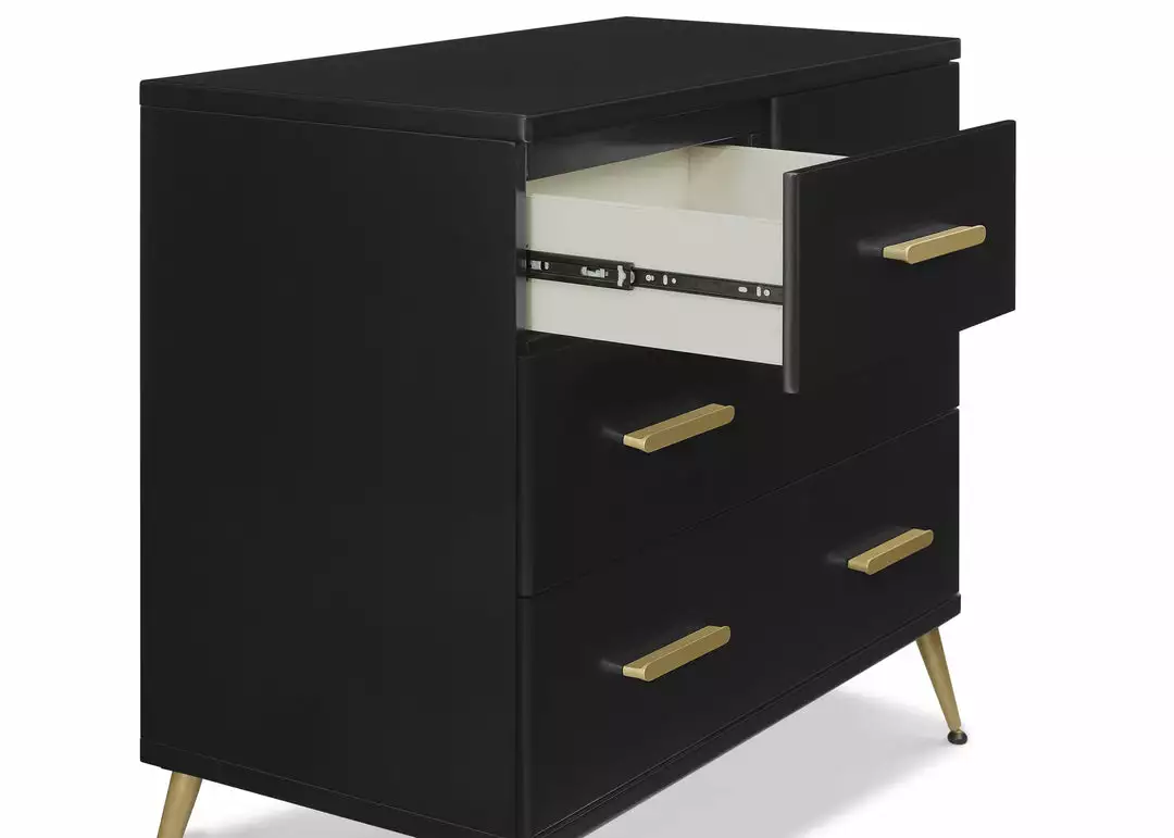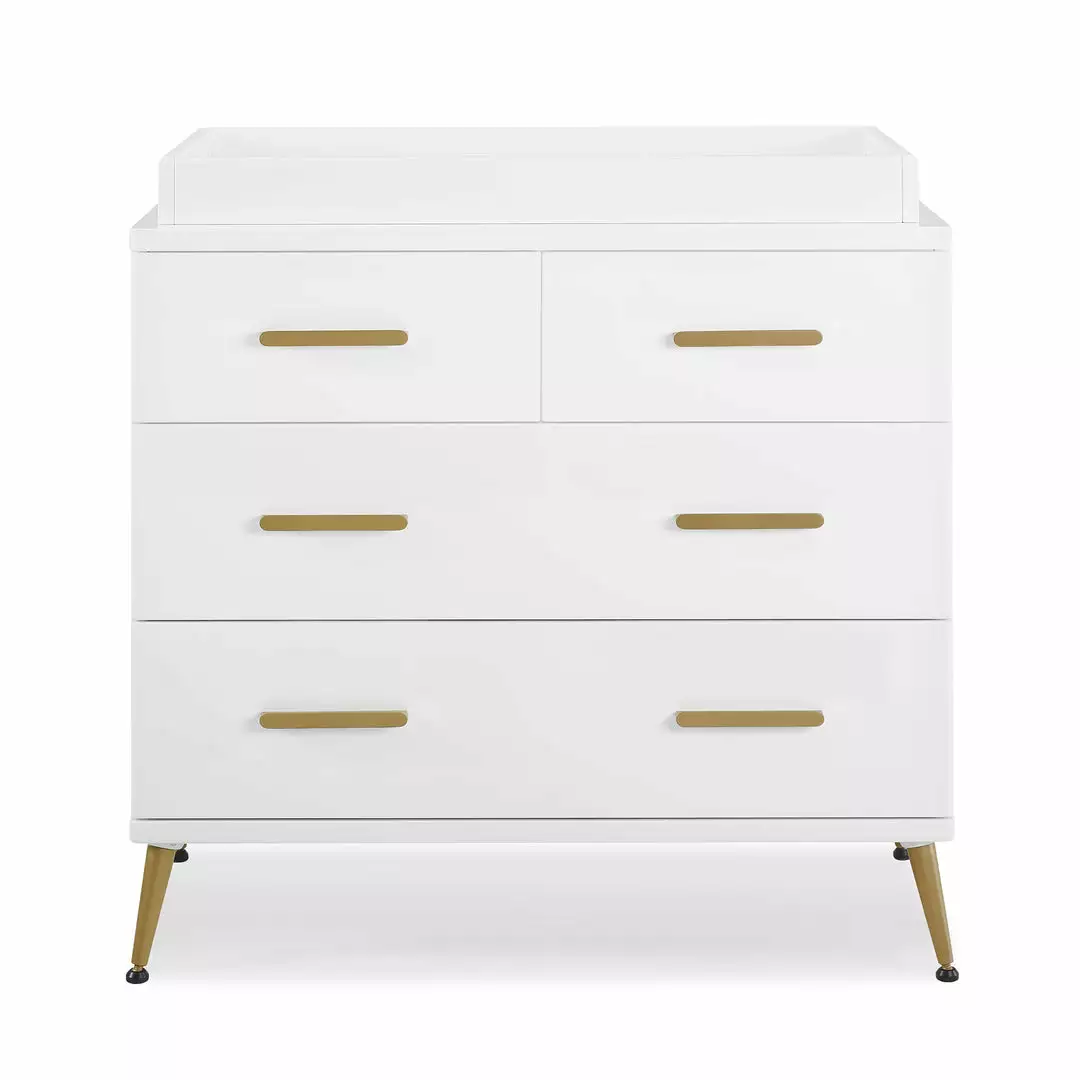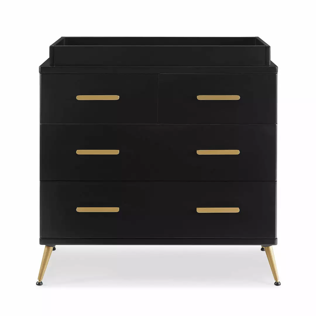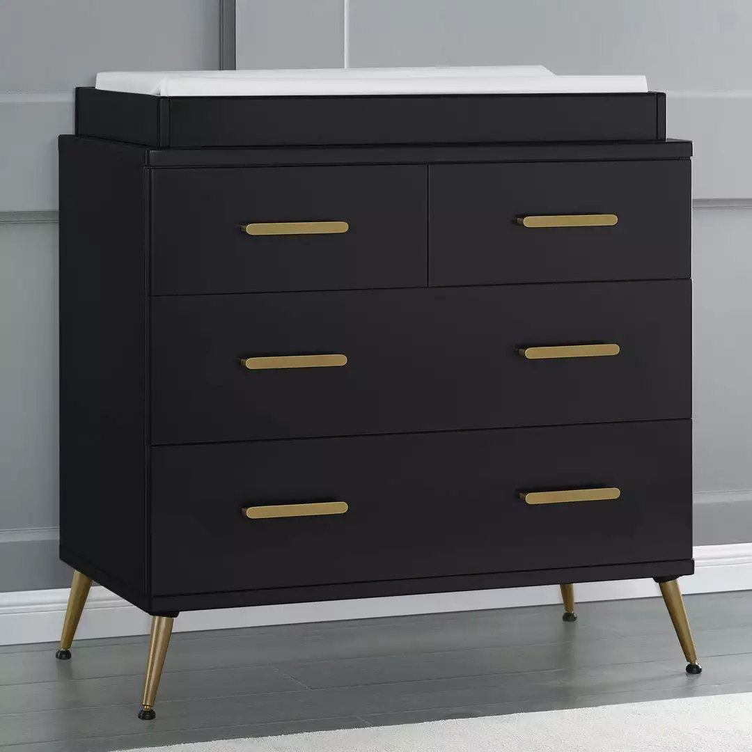 The Sloane 4 Drawer Dresser with Changing Top by Delta Children is the ultimate piece of kidsâ furniture. Sleek and modern, it boasts a mixed material design with bronze splayed feet and drawer handles that make it elevated enough for your master bedroom. But this dresser is more than just fashionableâit’s super functional, too. It features four spacious drawers for ample clothing storage and includes a removable changing top that creates the perfect space for diaper changing. Remove the changing top to create a more grown-up space later on. Pair this dresser with other pieces in the Delta Children Sloane Collection for a coordinated look.