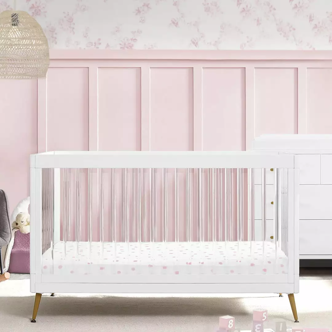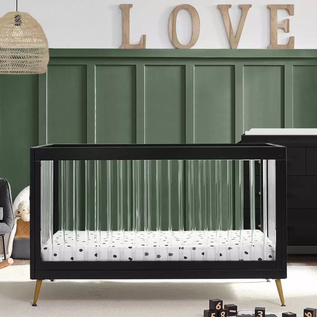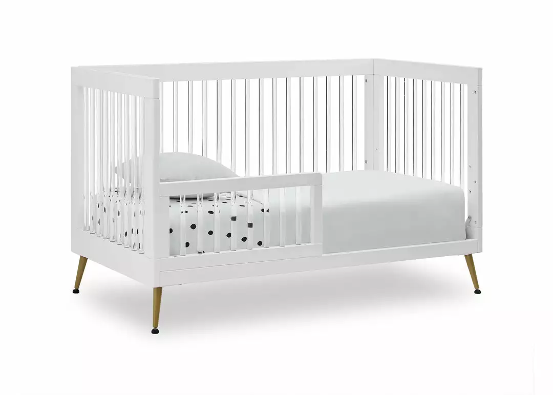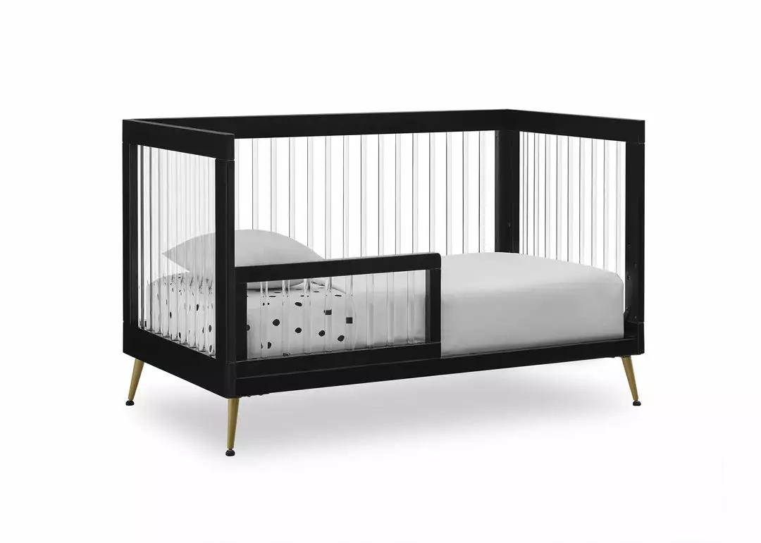 The Sloane 4-in-1 Acrylic Convertible Crib by Delta Children is the clear choice for your baby’s modern nursery! Its unique design features clear acrylic spindles that provide an open, airy feel while the splayed bronze feet add some polish to the clean lines. And if that’s not enough, it even converts from crib to a toddler bed, sofa and daybed, making this a versatile bed that grows with your child (conversion rail included). To complete your nursery, pair with the coordinating Sloane 4 Drawer Dresser.