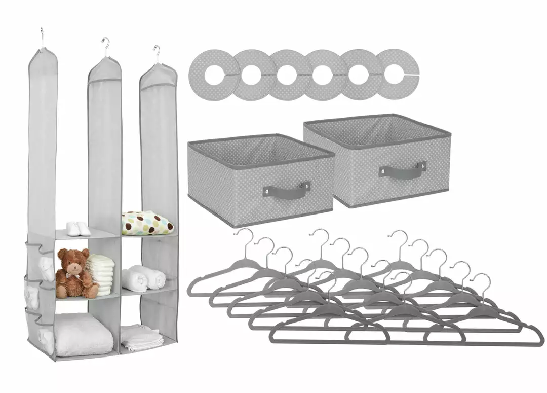 Get your nursery or childâs room in tip-top shape with this 24-Piece Nursery Storage Set from Delta Children! A complete closet and bedroom organization set, it gives you everything you need to straighten up your childâs drawers, shelves, closet and dresser. This handy set includes 15 velvet hangers, 6 closest dividers, two small bins, plus a six-shelf hanging organizer. Each item is designed specifically for kid-sized stuff with a durable construction that can handle heavy use. Use the items in this set to for baby clothes, burp cloths, bibs, socks, diapers, toiletries, and other nursery accessories. Purchase this set for your own babyâs room or as a baby shower gift for someone else. This 24-Piece Nursery Storage Set from Delta Children is available in a number of beautiful colors that will complement any space.