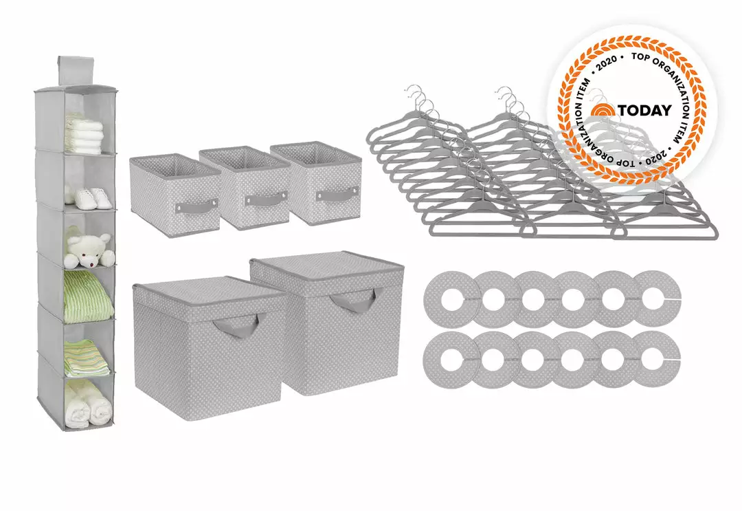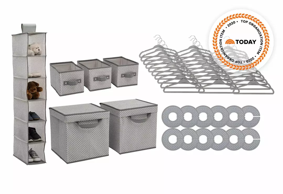 - What’s included in this 48-Piece Set: 30 slim flocked velvet hangers, 12 closest dividers that allow you to divide clothes by size or color, 3 small printed bins, 2 large printed bins with lids, 1 six-shelf hanging organizer