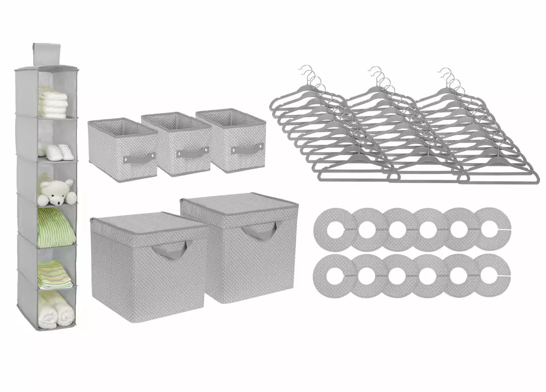 Get your nursery or child’s room in tip-top shape with this 48-Piece Nursery Storage Set from Delta Children! A complete closet and bedroom organization set, it gives you everything you need to straighten up your child’s drawers, shelves, closet and dresser. This handy set includes 30 velvet hangers, 12 closest dividers, three small bins, two large bins with lids, plus a six-shelf hanging organizer. Each item is designed specifically for kid-sized stuff with a durable construction that can handle heavy use. Use the items in this set for baby clothes, burp cloths, bibs, socks, diapers, toiletries, and other nursery accessories. Purchase this set for your own baby’s room or as a baby shower gift for someone else. This 48-Piece Nursery Storage Set from Delta Children is available in a number of beautiful colors that will complement any space.