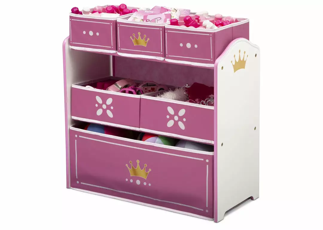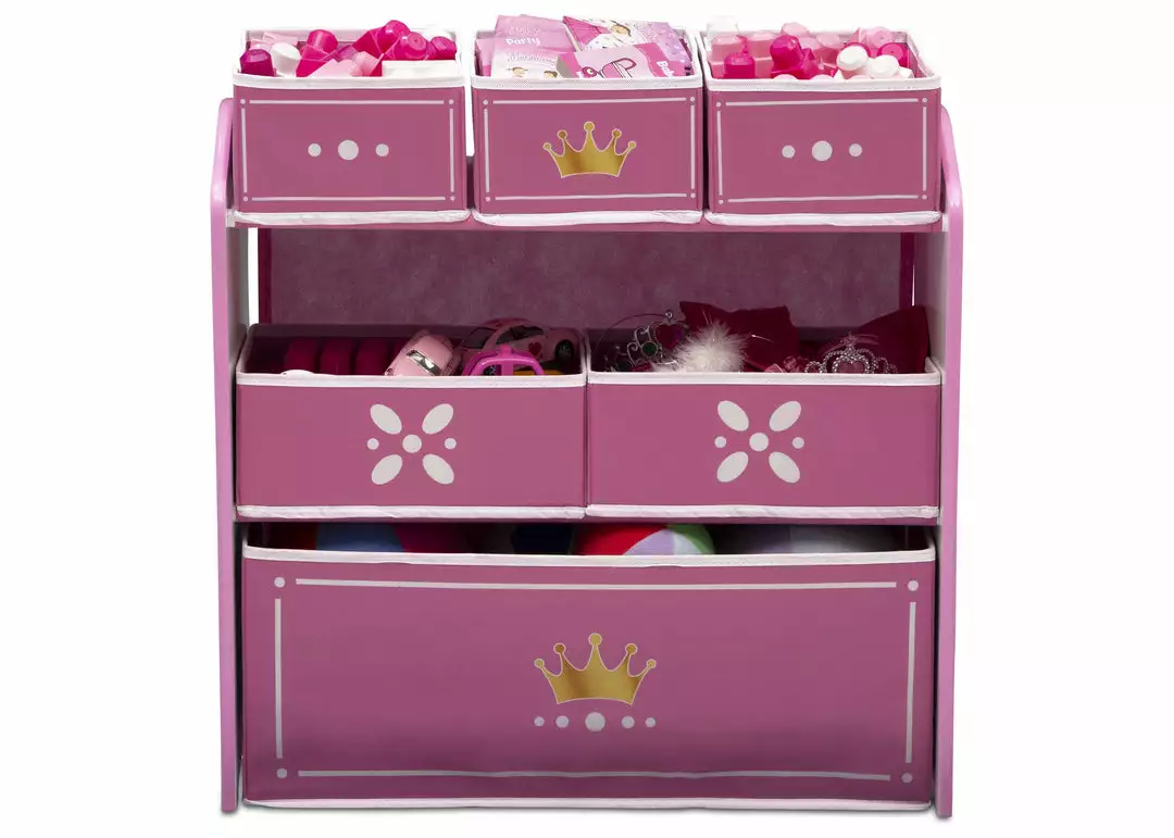- PRINCESS THEMED PERFECTION: This Multi-Bin Toy Organizer features metallic gold crown emblems and pretty, pink trim