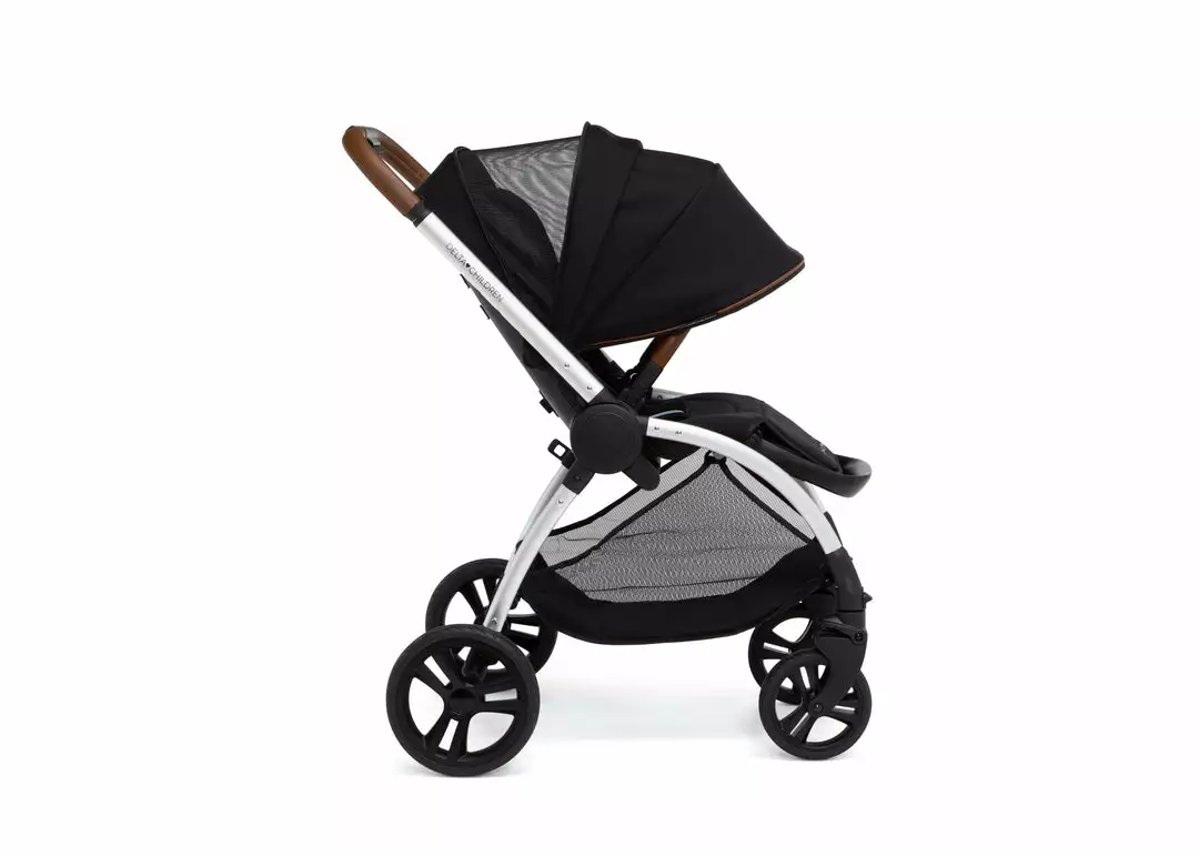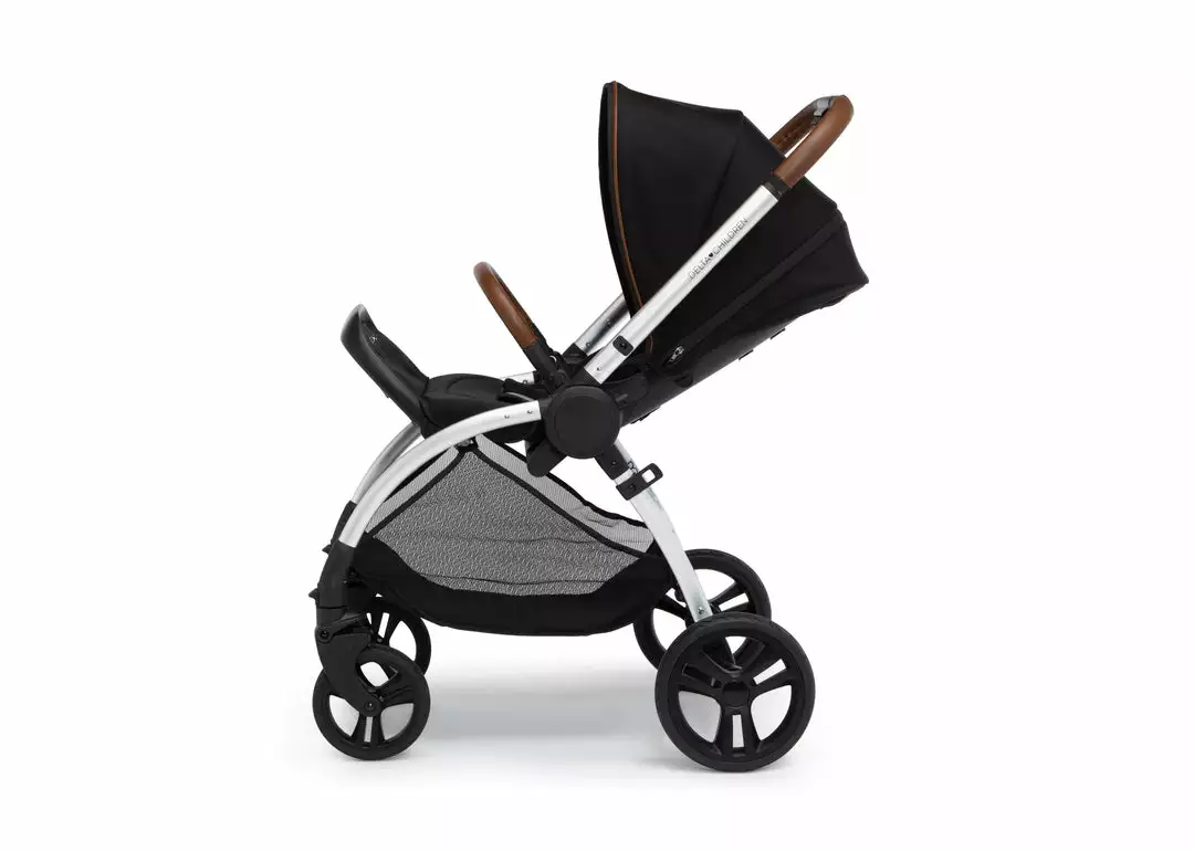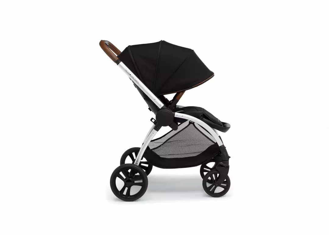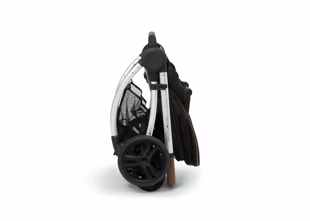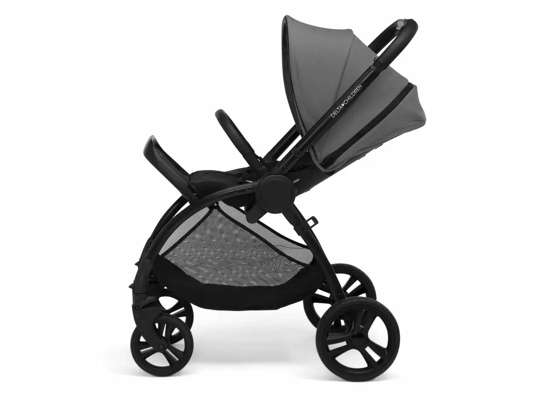 Light, compact and easy to maneuver, the Revolve Reversible Stroller by Delta Children is ideal for everything from city streets to park paths. With three ways to ride, its reversible seat can be positioned facing you or facing the world, and a car seat adapter allows you to easily attach the most popular car seats to the frame (car seat and adapter sold separately). Offering premium features any parent will appreciate, this ultramodern stroller has an expandable knit canopy with zippered peek-a-boo window and a soft, leather wrapped handlebar and child bar. Its reclining seat, adjustable footrest and all-wheel suspension system ensures the most comfortable ride for your little one. You’ll love the adjustable handlebar positions, spacious under-seat storage, as well as the front swivel wheels and one-step back break that allow you to easily maneuver the stroller in busy streets, airports or amusement parks. And, when you need to store or take the stroller with you, Its super-lightweight aluminum frame with a compact, one-hand fold can be done in parent-facing or front-facing mode. Perfect for city or suburban living, the Revolve stroller combines style, performance and function to create the ultimate stroller for modern parents and their little explorers. Holds up to 50 lbs.