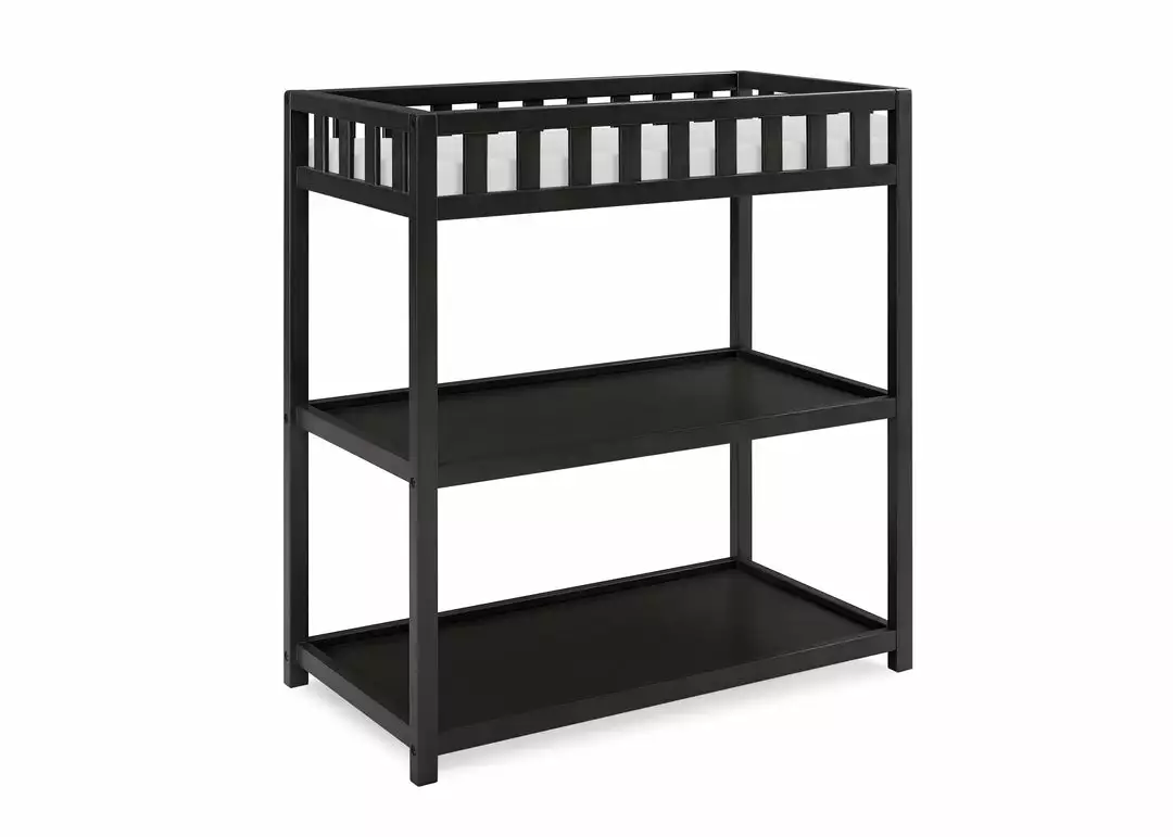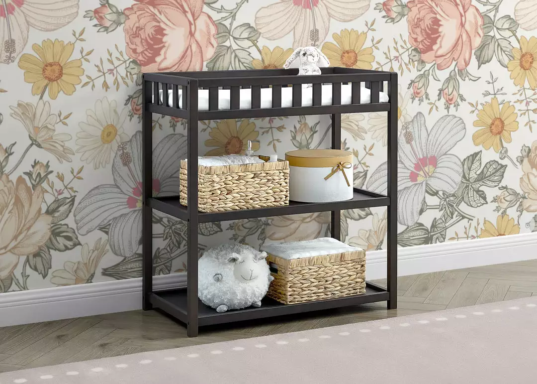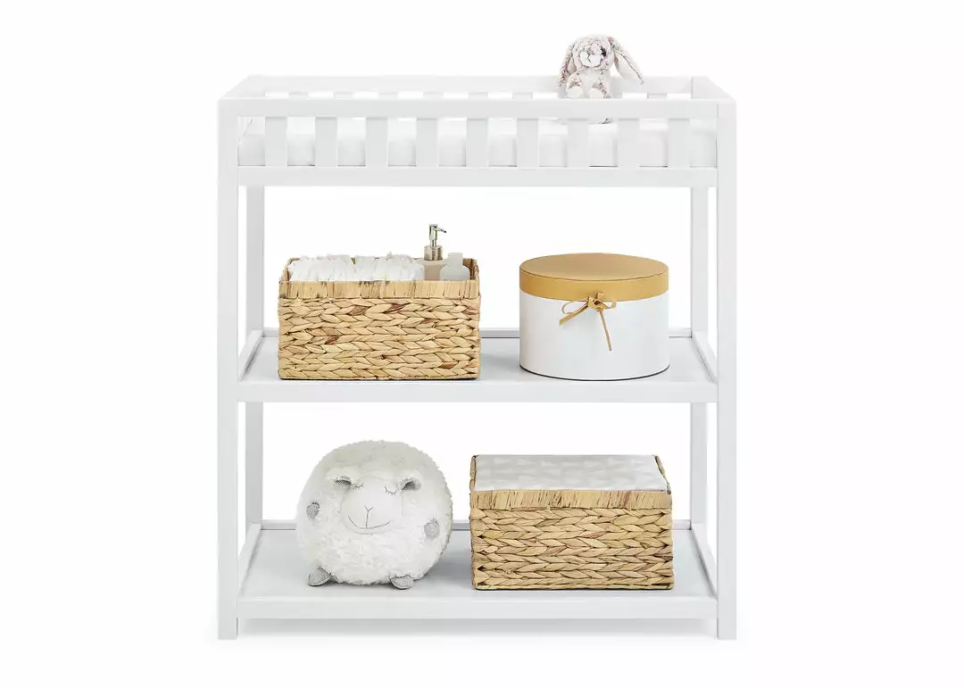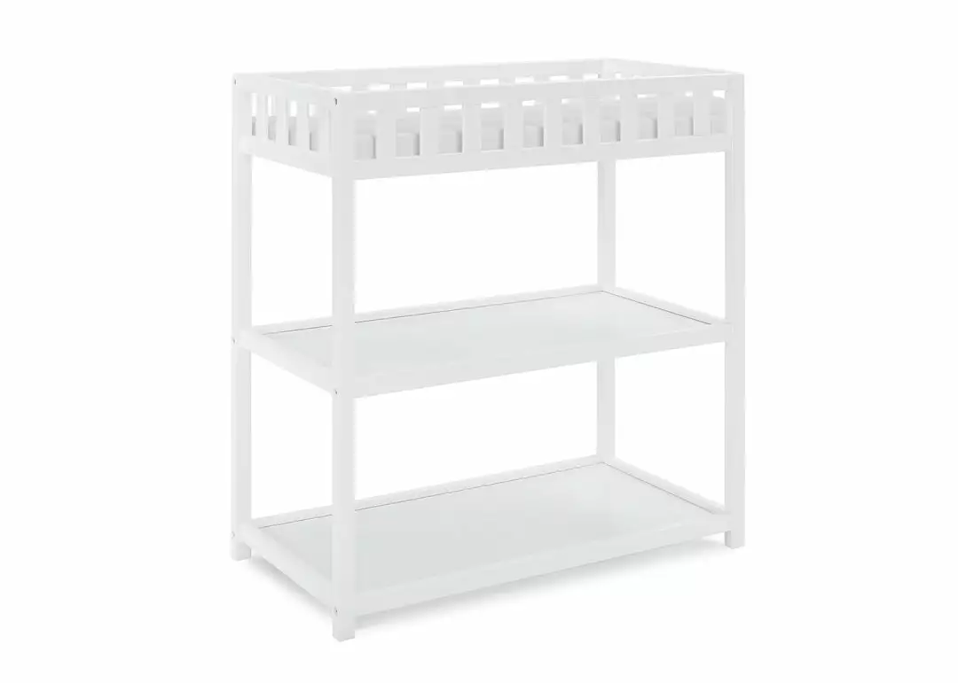The Sweet Beginnings Changing Table by Delta Children is designed for effortless dressings and diaper changes. The perfect choice for your nursery, it features a classic silhouette with its flat top and decorative slat railing. Packed with value and convenience, this sturdy changer has two open shelves that allows you to keep toiletries or clothing within reach. It’s versatile design coordinates with other items in the Sweet Beginnings collection. Changing pad sold separately.
