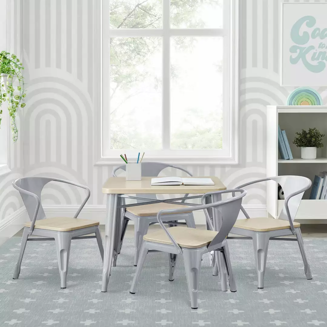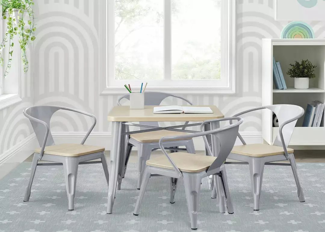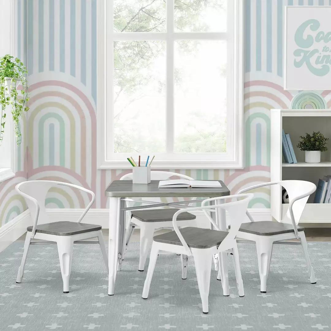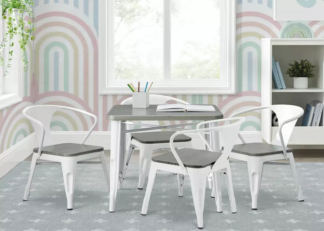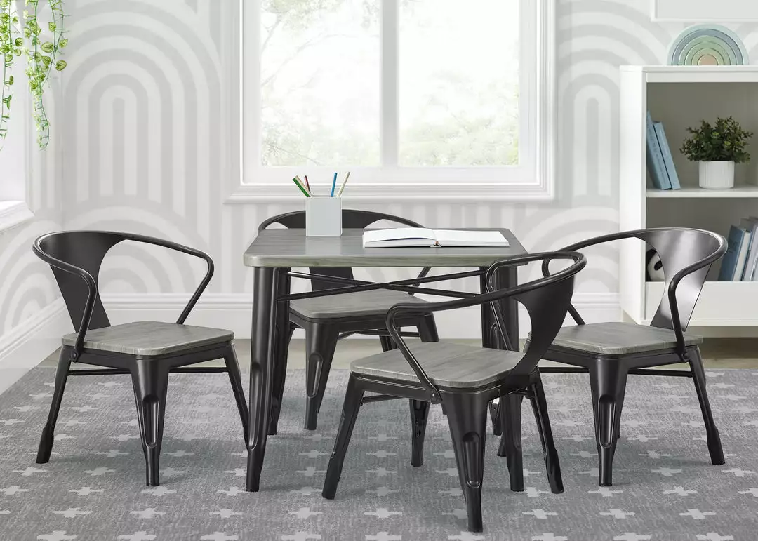 The perfect foundation for fun and learning, the Bistro Table and 4 Chair Set by Delta Children features a printed wood grain and painted metal legs. Whether your child uses it for art projects, tea parties, snack time or homework, this kids’ play table and chair set will enhance their sense of wonder no matter what activity they use it for. Sized just right for your growing child—the generous 20-inch height of this sturdy play table and 11.25-inch seat height ensures it can be used for many years. The table’s fun mixed material construction will complement existing bedroom, playroom or living room décor, easily allowing you to create a space that works for kids and adults alike. Rubber feet on table and chair’s legs protect the floor from scratches. Recommended for ages 3+.