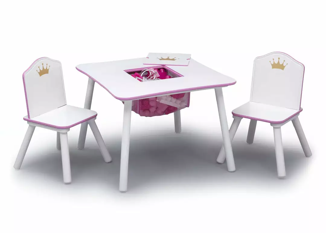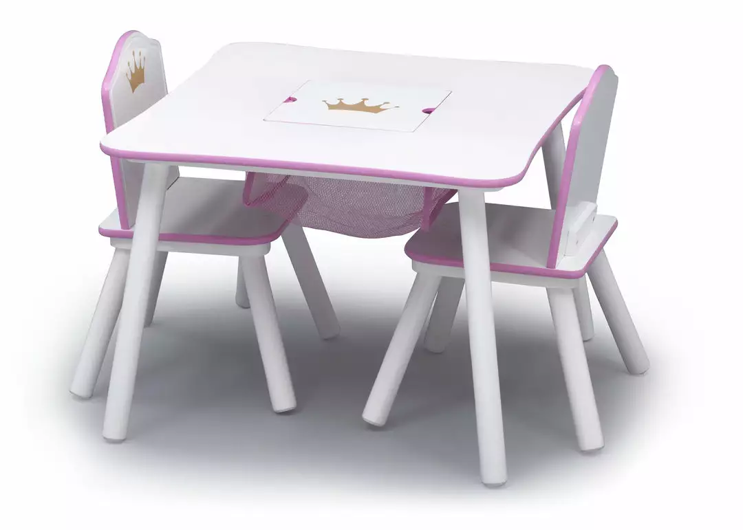 The Princess Crown Kids Chair Set and Table from Delta Children is fit for a fairytale. The set includes two chairs with metallic gold crown emblems on the backs and a coordinating table with a storage cubby in the middle to keep art supplies or toys. The perfect place to hold court, tea parties, tackle art projects or eat, this durable wood chair set and table will encourage a fun environment for your little one to learn and play. The Princess Crown Kids Chair Set and Table coordinates with other items in the Princess Crown Collection from Delta Children.