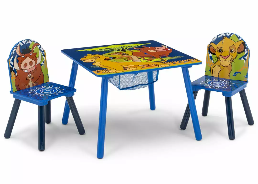 The Lion King Table and Chair Set with Storage by Delta Children is built for a roaring good time! Featuring full color character art of Simba, Timon and Pumbaa, this set includes a table and two chairs, designed at the perfect kid-sized height, making it ideal for snack time, playtime or homework. Plus, a built-in storage compartment at the center of the table provides the perfect space to keep art supplies and toys.