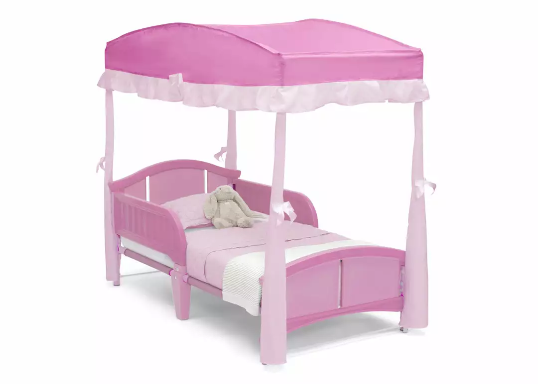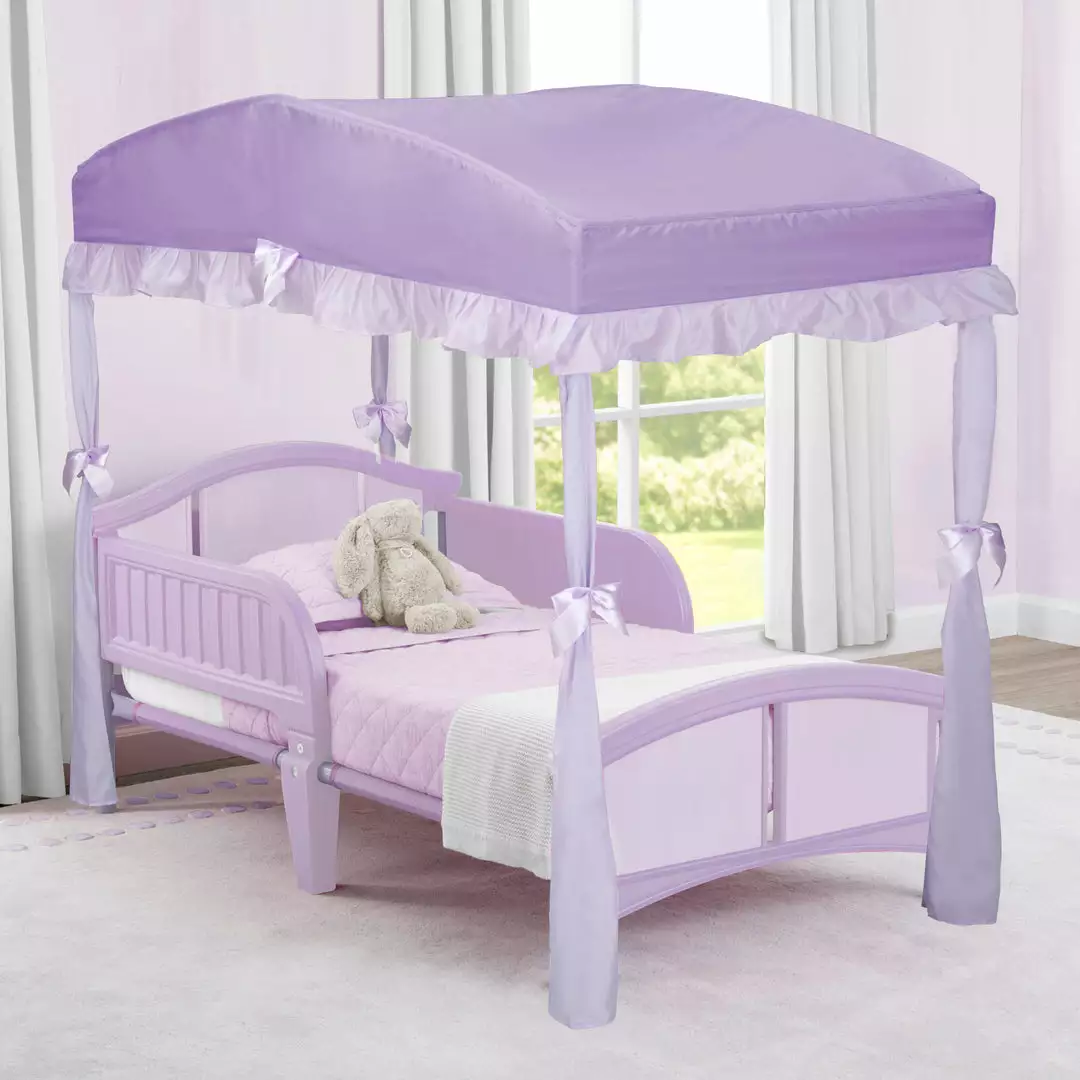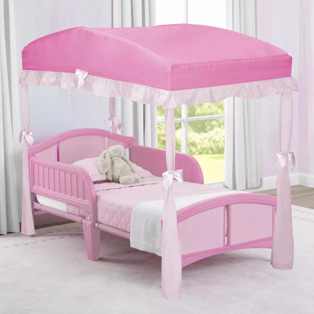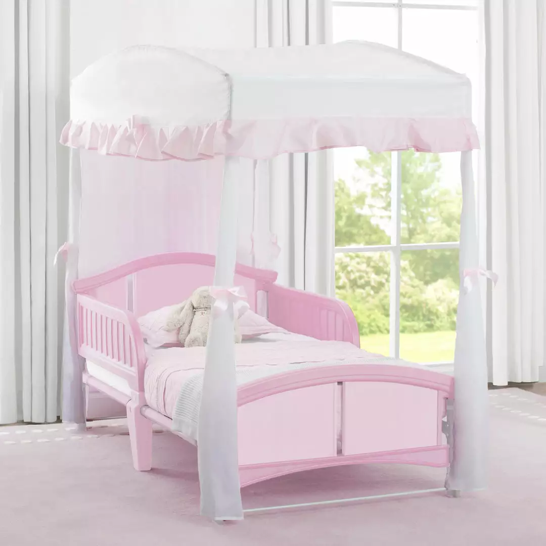 Transforming your girl’s bedroom into a kingdom fit for a royal is easy with Delta Children’s Toddler Bed Canopy! Trimmed with ruffles and fabric held in place by ribbon bows, it sets the scene for a whimsical sleep space. Simple to set up, the four plastic poles attach to most standard size toddler beds, and make bedtime so much more magical.