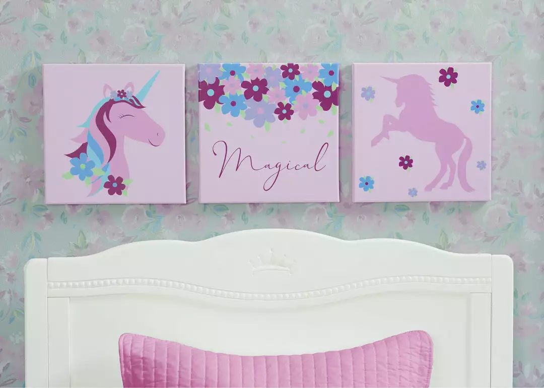 This Unicorn 3-Piece Wall Art Set by Delta Children will brighten up any space. Designed to create a gallery wall full of color, these three large canvases feature graphics of unicorns, flowers and âMagicalâ typography. Printed on poly canvas and wrapped around a wood frame, each piece features a sawtooth backing for easy mounting. Place all three canvas on the same wall, spread them around the room or lean them against the wall on a dresserâyouâll add a dash of charm wherever you place them. Ideal for unicorn-inspired nurseries or bedrooms, this wall art set coordinates with the Unicorn Rug by Delta Children (sold separately).