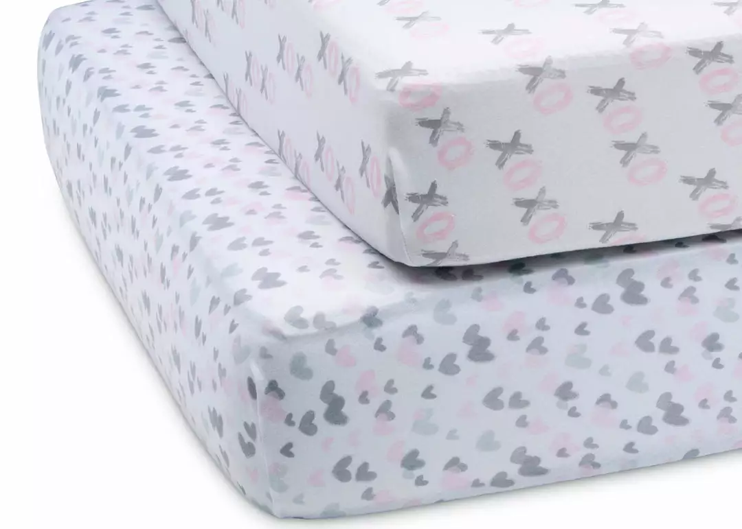 These Printed Fitted Crib Sheets (2-Pack) by Delta Children are soft, stylish and perfect for your babyâs nursery. Made of jersey knit cotton, these fitted crib sheets keep their softness, wash after wash. Elasticized edges all around create a snug fit on standard-size crib mattresses. And you can never have enough sheets for your baby, so grab a few sets to keep up with accidents or spills! These sheets are machine-washable for easy care. Available in a number of easy-to-coordinate prints.