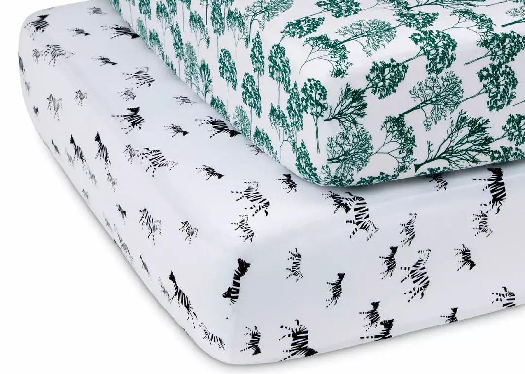 These Printed Fitted Crib Sheets (2-Pack) by Delta Children are soft, stylish and perfect for your babyâs nursery. Made of jersey knit cotton, these fitted crib sheets keep their softness, wash after wash. Elasticized edges all around create a snug fit on standard-size crib mattresses. And you can never have enough sheets for your baby, so grab a few sets to keep up with accidents or spills! These sheets are machine-washable for easy care. Available in a number of easy-to-coordinate prints.