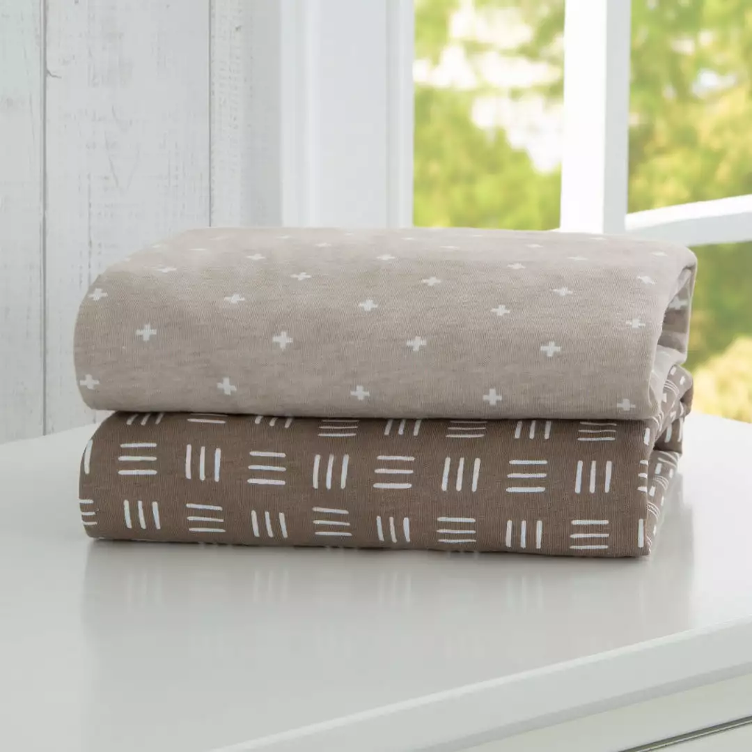 These Printed Fitted Crib Sheets (2-Pack) by Delta Children are soft, stylish and perfect for your babyâs nursery. Made of jersey knit cotton, these fitted crib sheets keep their softness, wash after wash. Elasticized edges all around create a snug fit on standard-size crib mattresses. And you can never have enough sheets for your baby, so grab a few sets to keep up with accidents or spills! These sheets are machine-washable for easy care. Available in a number of easy-to-coordinate prints..