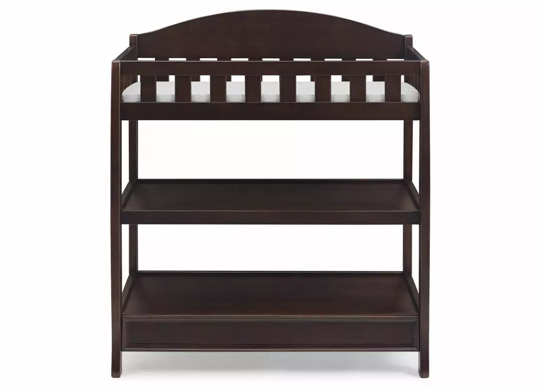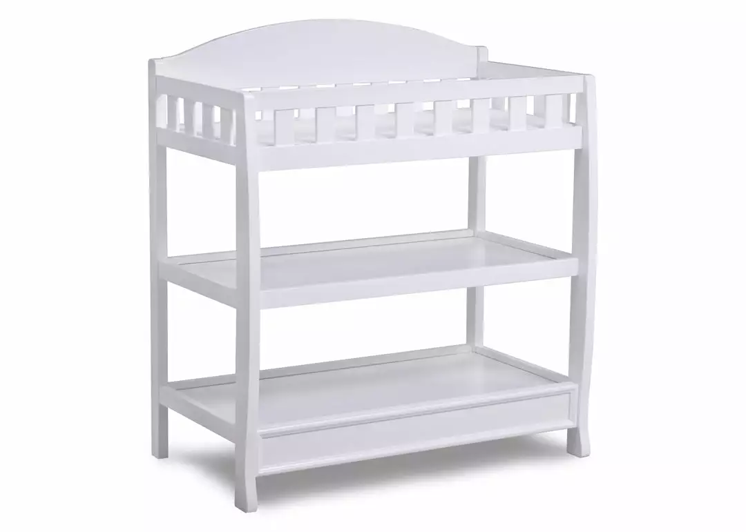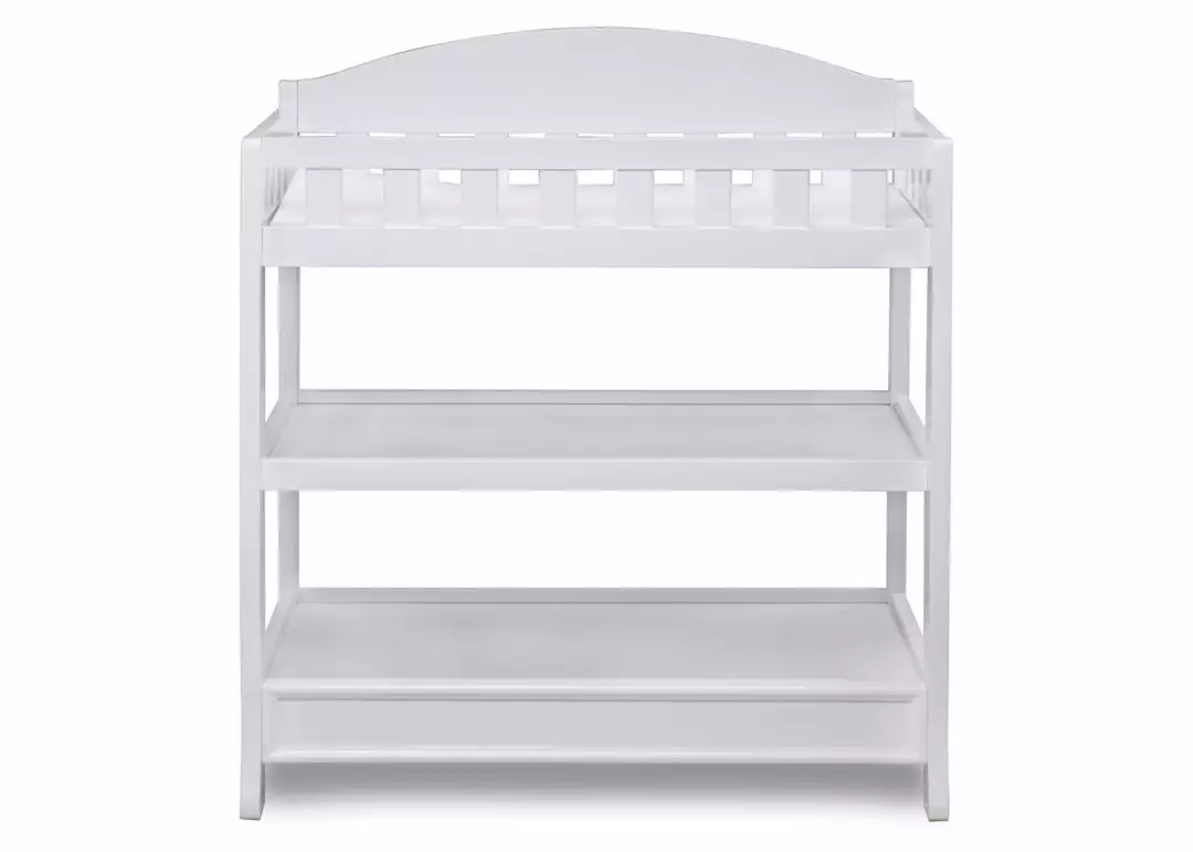 Change or dress your baby in absolute comfort with the Wilmington Changing Table by Delta Children. Designed with a timeless bell-shape silhouette and versatile features that make diaper changes easier, this changing table has two shelves that allow you to store your child’s changing and dressing necessities nearby. The included changing pad comes with an attached safety strap and is placed in a fully enclosed dressing area that provides extra security. The Wilmington Changing Table is available in several popular finishes and coordinates with many Delta Children cribs.