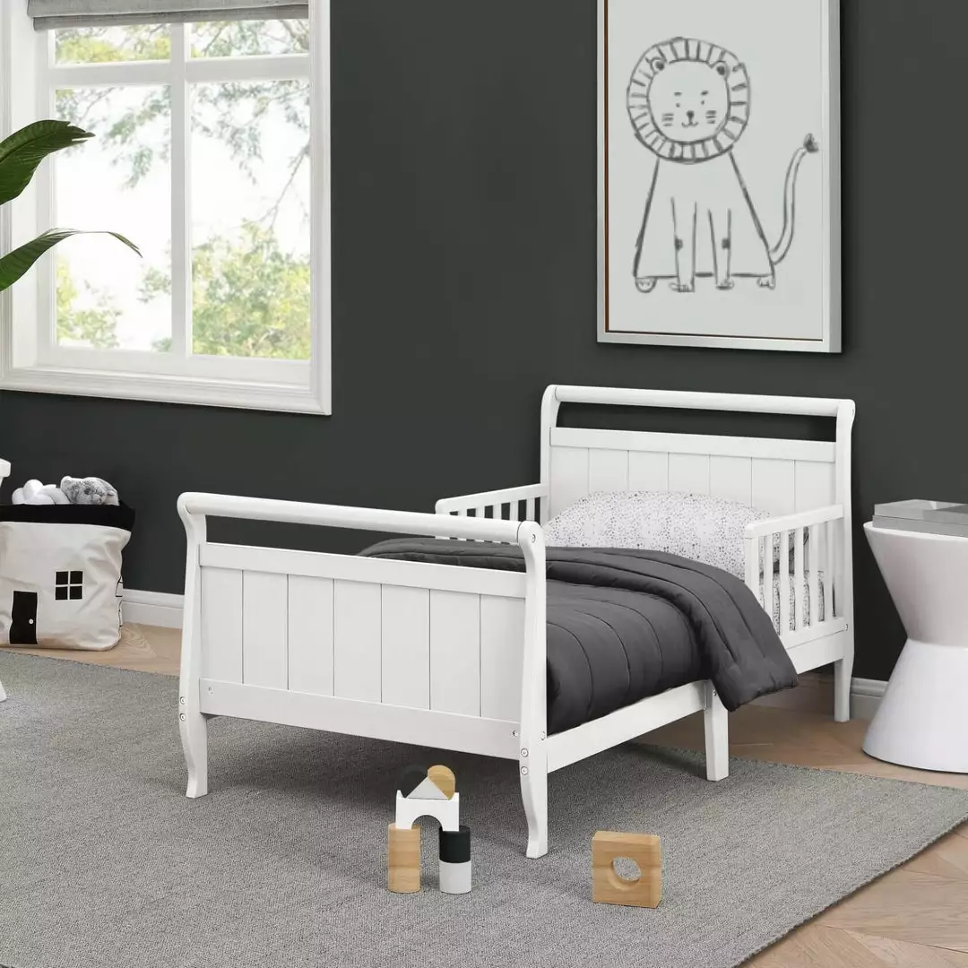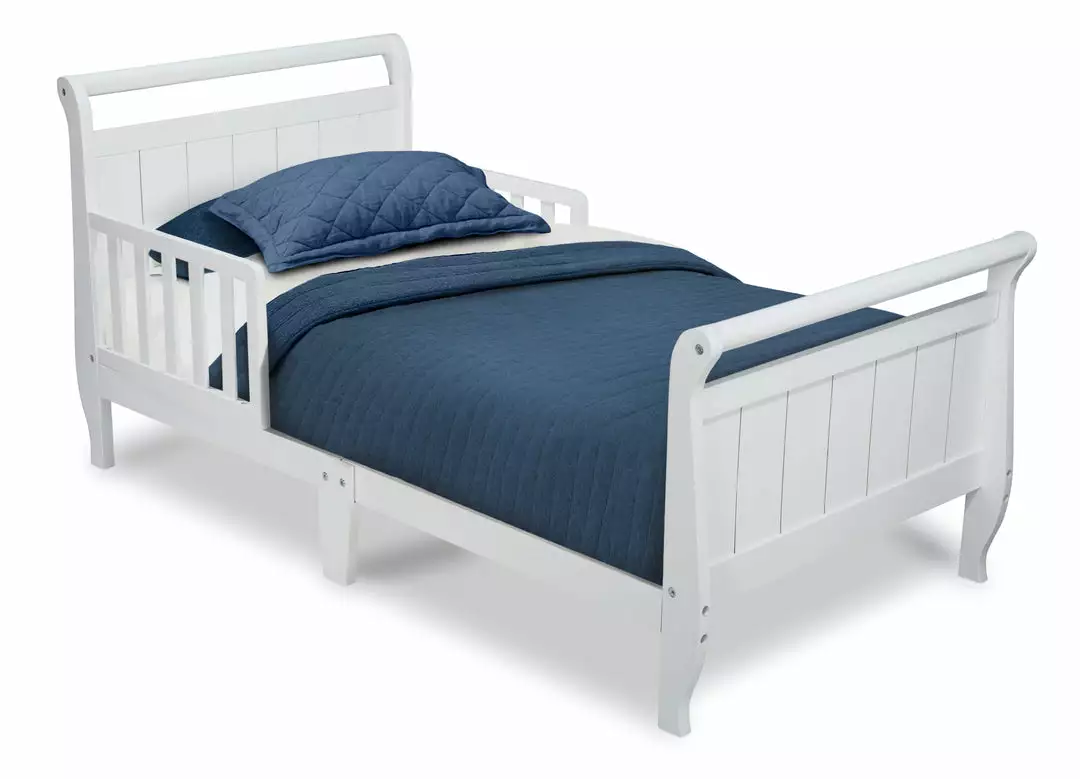 Tuck your little one in for a night of sweet dreams with this Wood Sleigh Toddler Bed by Delta Children. Made from sturdy hardwood, it has an elegant sleigh-style design, bringing a timeless look to any bedroom. Attached guardrails give you added security and keep your little one safe throughout the night. It’s the perfect bed for toddlers who have outgrown their cribs and are making the transition to big-kid bed. Bed fits a standard size crib mattress (mattress sold separately). Recommended for ages 15 months+.