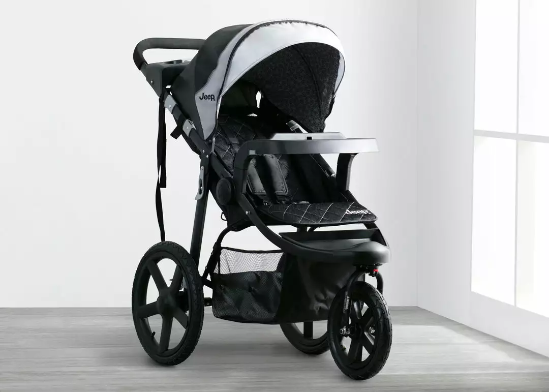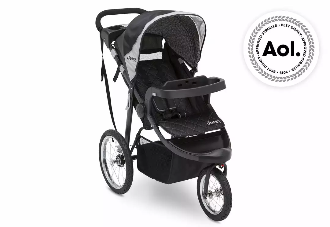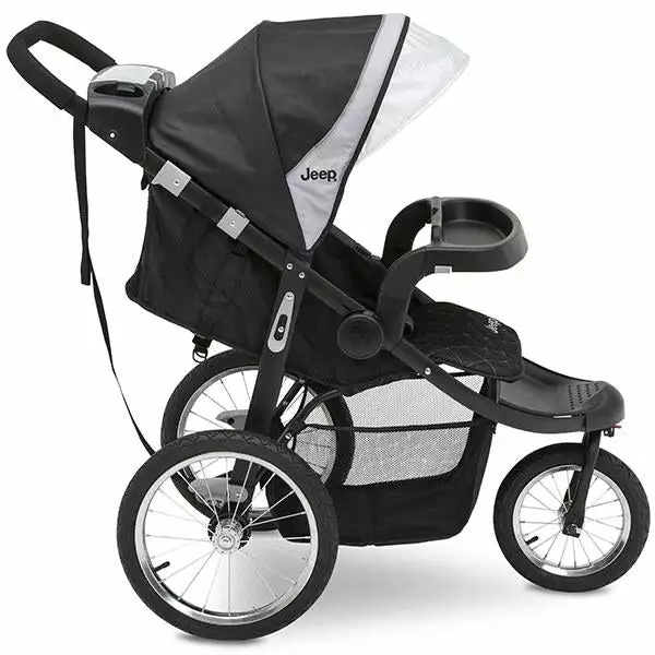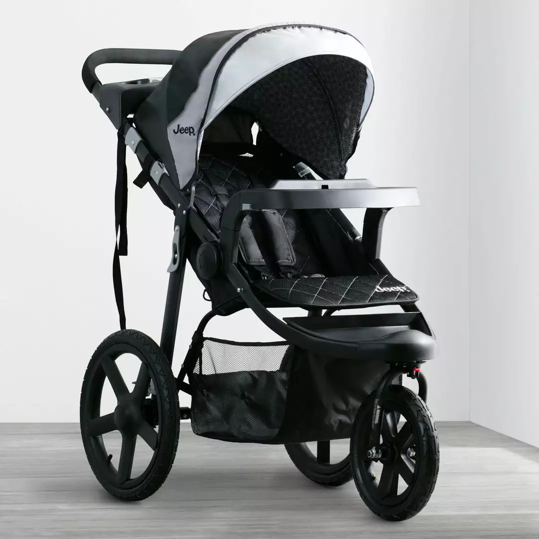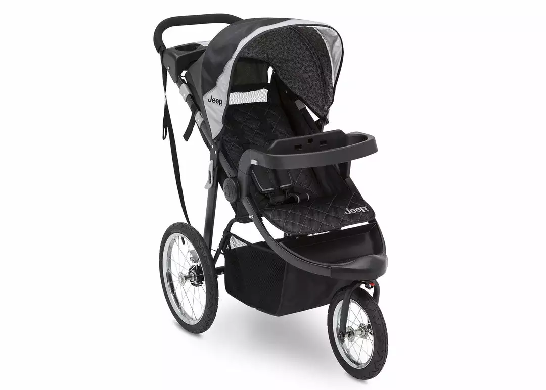 Designed for on-the-go parents and ever-growing babies, the Jeep Deluxe Patriot Open Trails Jogger by Delta Children makes it easier than ever to run errands (or laps!) with your child. This jogging stroller accepts a number of popular infant car seats with a secure attachment to create your own travel system. An all-terrain jogging stroller with an ultra-sleek look, it features cool pops of color, high-tech fabrics and chic, silver spokes that ensure it expertly blends fashion with function. Ready for anything, the stroller has swivel front wheel for maximum maneuverability–lock the front swivel wheel in place for jogging and unlock it for low speed strolling. The jogger’s wide ergonomic handle bar is easy to grab and steer, and comes with a safety tether that easily attaches to your wrist as you jog. To keep your child comfortable as you stroll, it features a reclining seat and extendable European-style canopy with sun visor to protect them from the elements. A child tray that swings up and out allows you to effortlessly load and unload your child while a spacious bin under the carriage, and a convenient parent tray with cup holders and a clear compartment to keep your phone within view and reach provides ample storage space. To make storing or transporting stress-free, the stroller folds quickly and compactly, and the back tires can be easily removed to stow away into your trunk. Holds up to 50 pounds/ 42 inches.