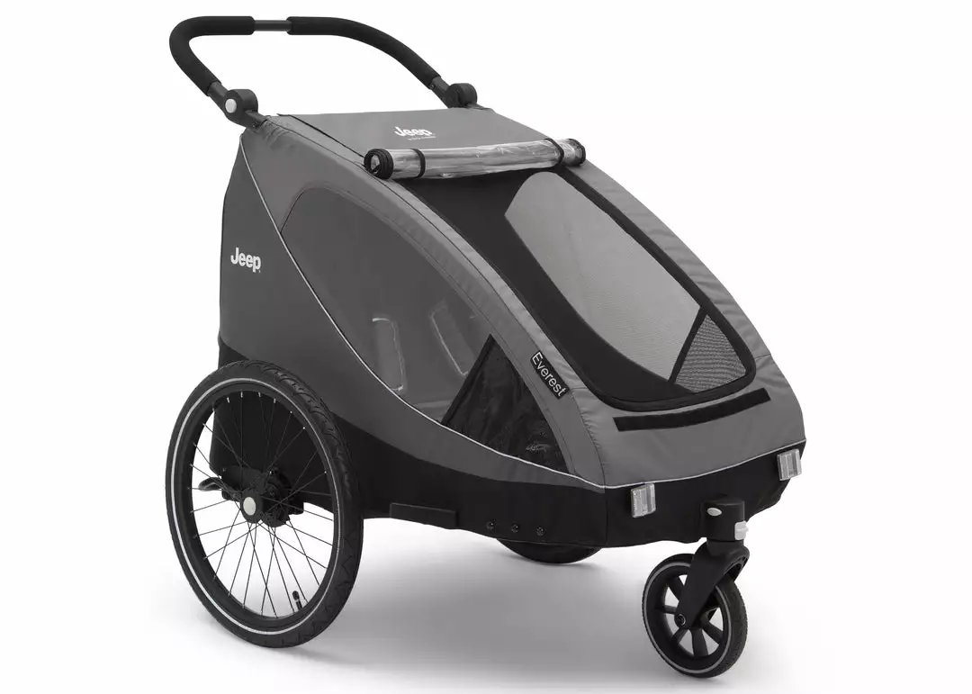 Take the whole family along for any adventure with the Jeep Everest 2-in-1 Bike Trailer and Stroller for 2 Kids by Delta Children. A durable bicycle trailer that easily transforms into a double stroller once you reach your destination, it provides a comfortable ride for two children. The included universal bike hitch easily attaches to most bicycles and the included stroller kit allows you to go from biking to strolling quickly by adding a front wheel. Designed to keep kids comfortable, the trailer features a large front mesh window, roll down rain shield and roll down windows on both side with mesh vents for airflow. An adjustable handlebar provides comfort for parents while in stroller mode and spacious rear cargo storage space can house frisbees, footballs, foodâwhatever your family needs while on the go. And when your outing is over, the compact, flat fold makes travel and storage easier than ever. For your safety, trailer includes safety flag, reflective piping, and two 5-point safety harnesses.