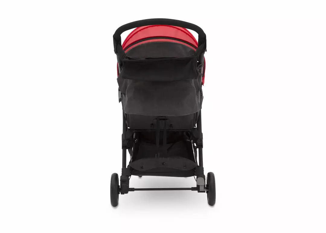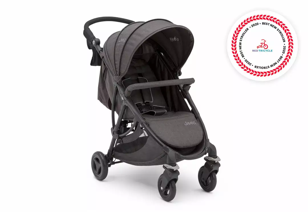 Lightweight, compact and adaptable, the Jeep Gemini Stroller by Delta Children is the most versatile option for busy families. An extremely lightweight, all-in-one stroller, it weighs under 20 pounds and features a compact, one-hand fold that makes caring for baby and running errands easyâthe auto-lock feature ensures the stroller stays folded during transport or while in storage. Easily convertible, the strollerâs aluminum frame becomes an infant stroller in seconds, the car seat adapter (sold separately) works with the most popular car seats and creates a convenient travel system for your baby. As your child grows, the strollerâs removable child bar, reclining seat, adjustable footrest and extendable canopy with zippered peek-a-boo mesh window accommodates their every need. For your comfort, adjust the foam handlebar to your ideal position, and keep all of your essentials within reach thanks to oversized storage bin and the handy parent storage tray that features two cup holders and covered storage for your phone, wallet or keys. Agile and effortless, front swivel lock wheels and back wheels with suspension and one-touch brakes make navigating busy streets and turning corners easy. Stroller holds up to 50 lbs.