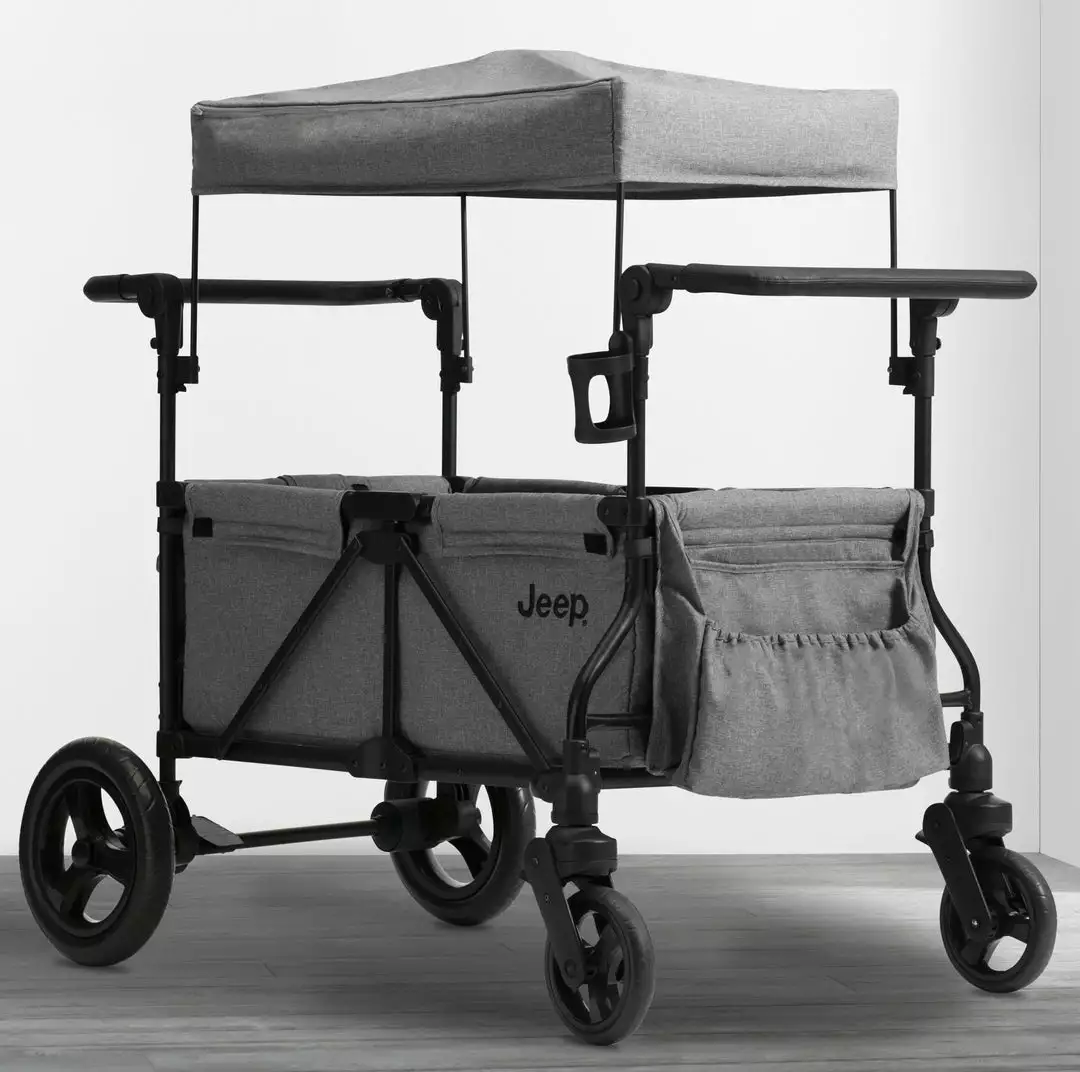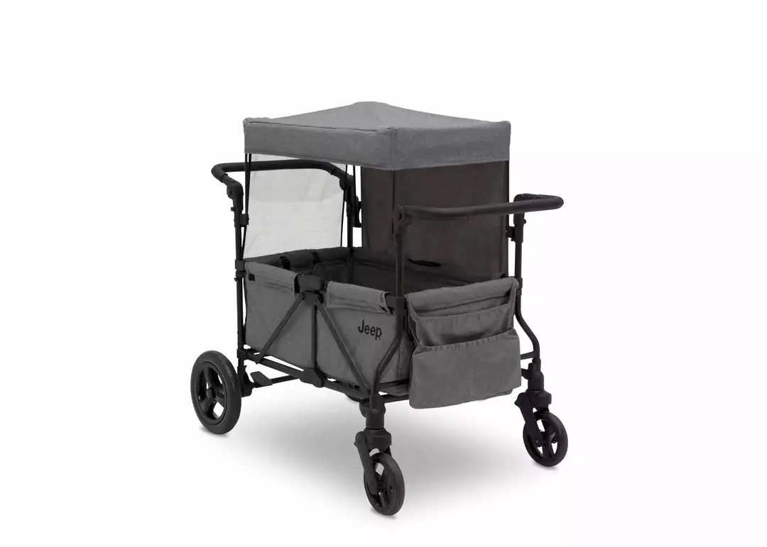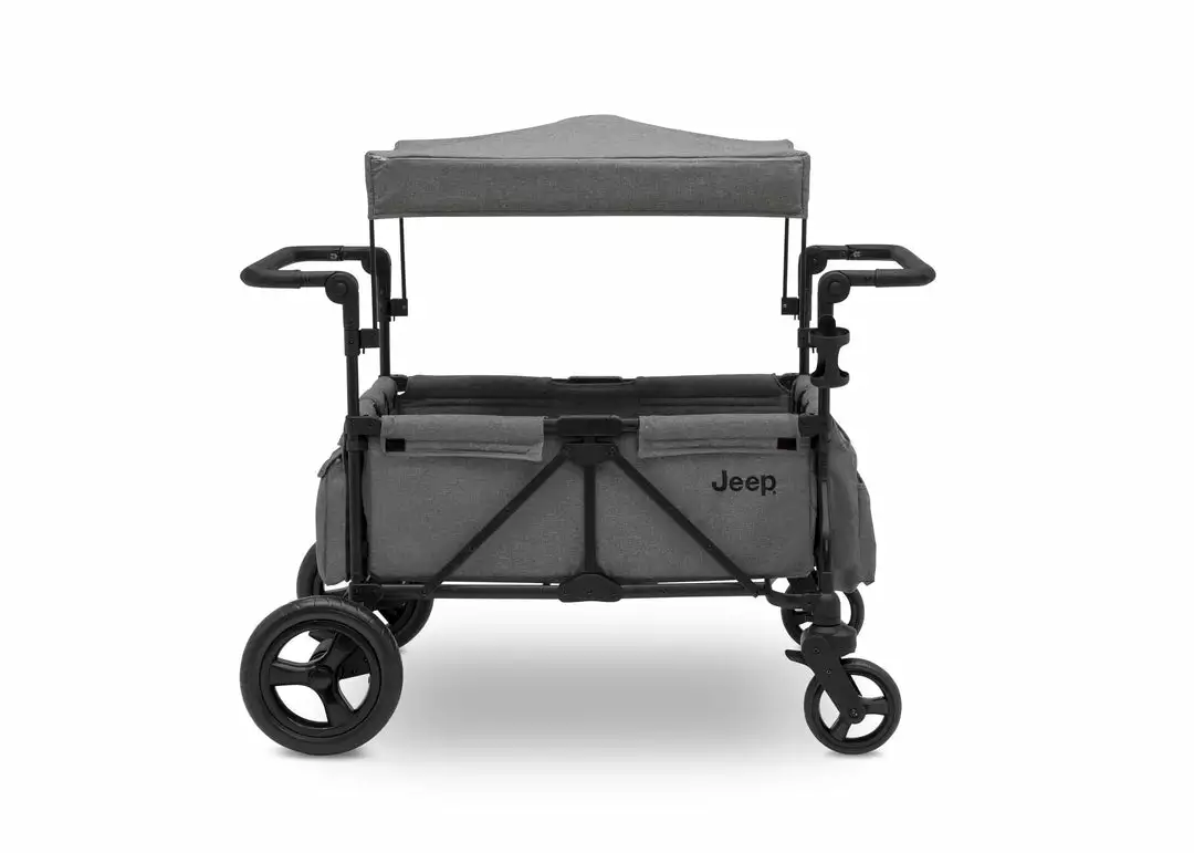 The Jeep Wrangler Stroller Wagon by Delta Children is ready to tackle any adventure. With so many ways to ride, itâs ideal for families with kids of varying ages. Attach your current infant car seat with the included adapter for babies or use the two seats with 5-point safety harnesses to securely transport older siblings, twins or friends.