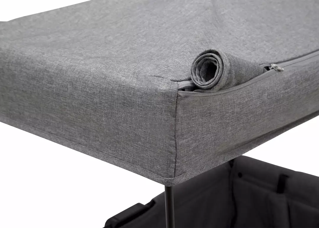 - Removable UV blocking fabric/mesh canopy and roll-down shades for sun protection and privacy
