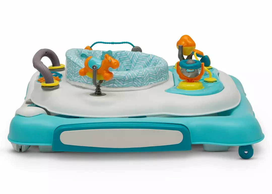 The Little Folks 4-in-1 Discover & Play Musical Walker by Delta Children will have little ones moving their feet to the beat! Baby will activate different sounds with their feet as they play–the musical foot petal helps develop coordination and gross motor skills while also promoting music appreciation. An adaptative walker that helps babies balance, stand and walk, it features four distinct modes to accommodate your growing child. The 360-Degree Activity Center Mode allows baby to interact with all the toys, sounds, colors, shapes and animals on the walker by spinning all the way around in the comfy seat. The Rocker Mode sways gently back and forth while still incorporating all the toys from the Activity Center. Walker Mode encourages baby to simulate walking movements, and the Push Behind Mode provides balance for new walkers with a sturdy handle on the back. A great toy for baby, the 4-in-1 Discover & Play Musical Walker will drum up some fun every time you use it!