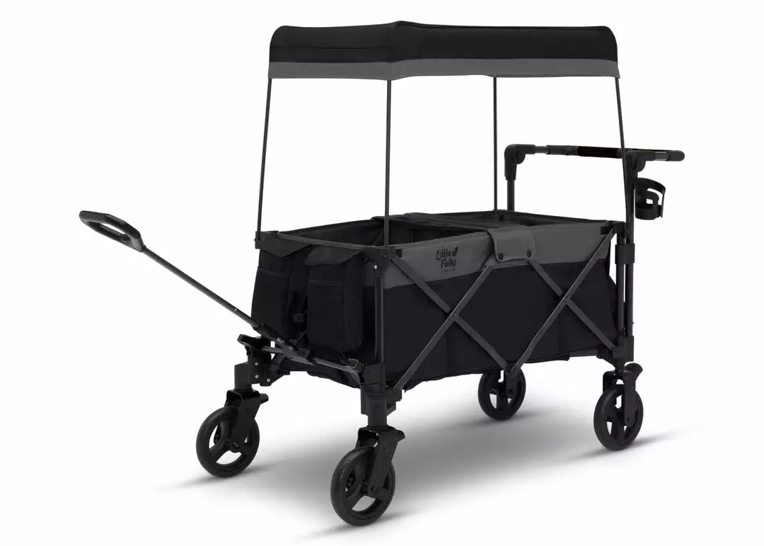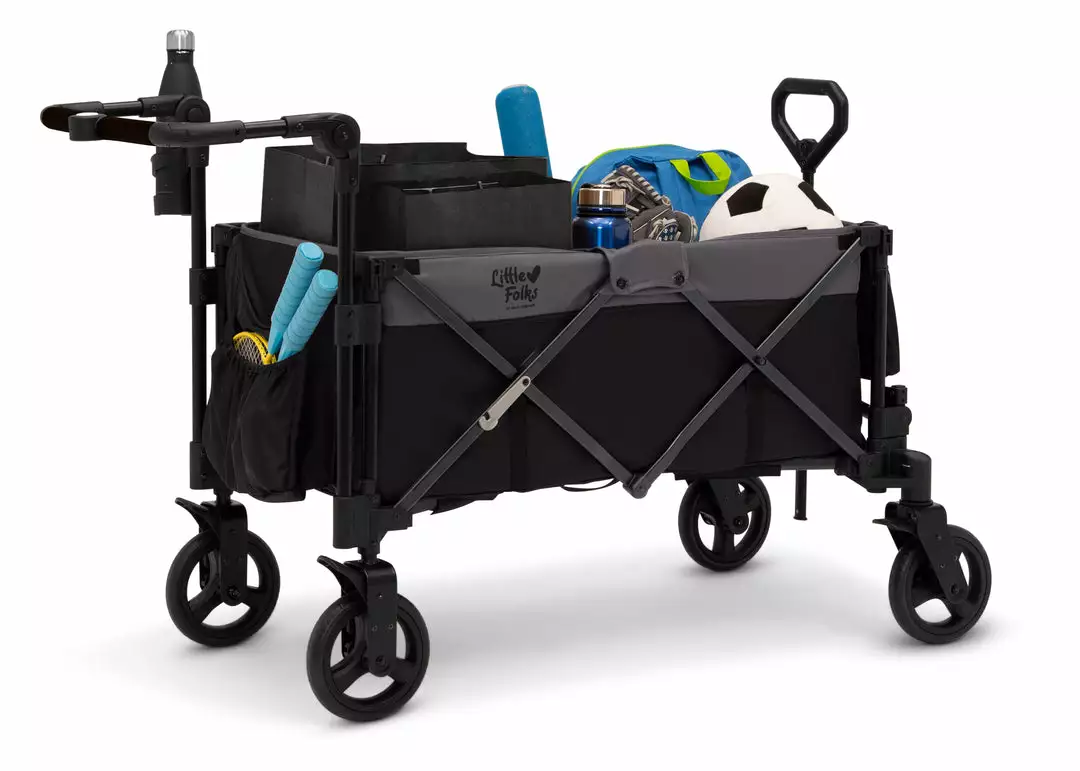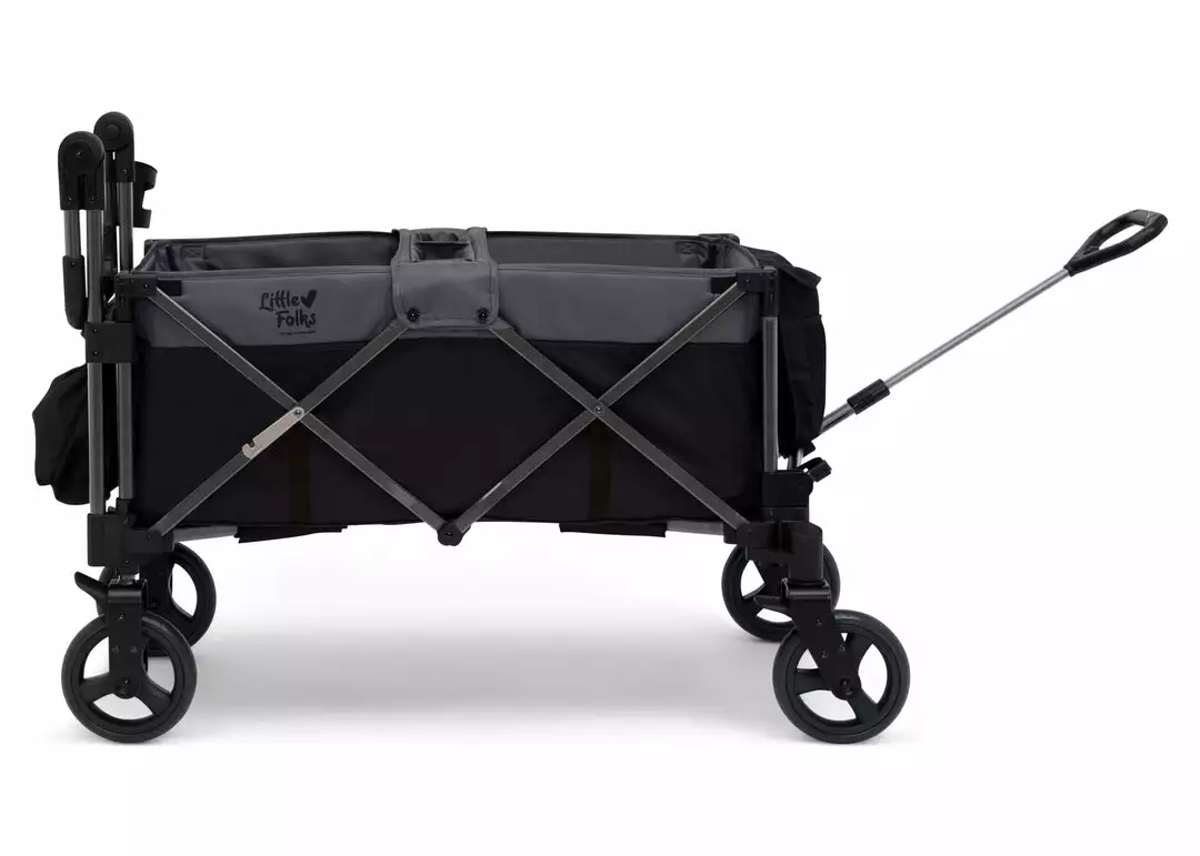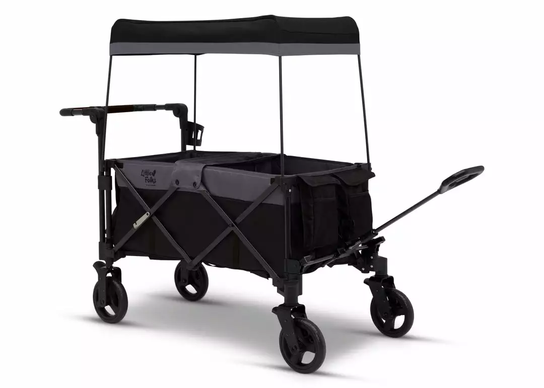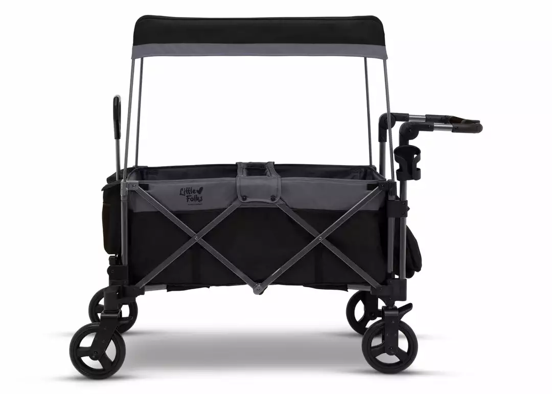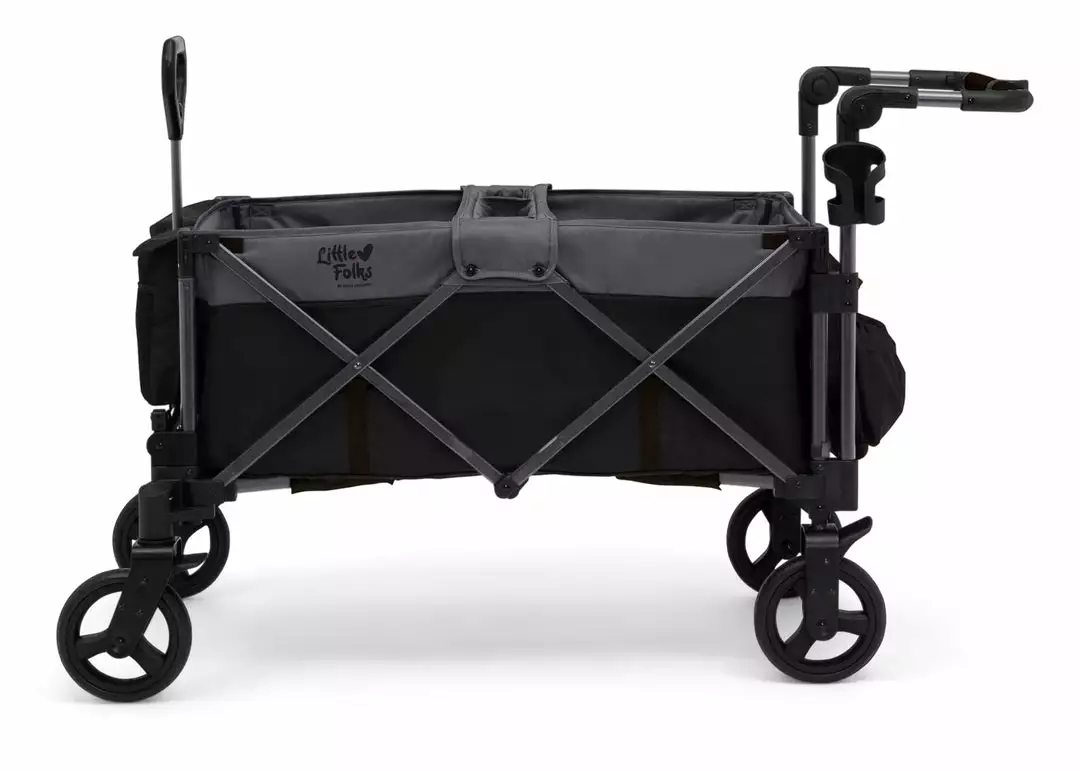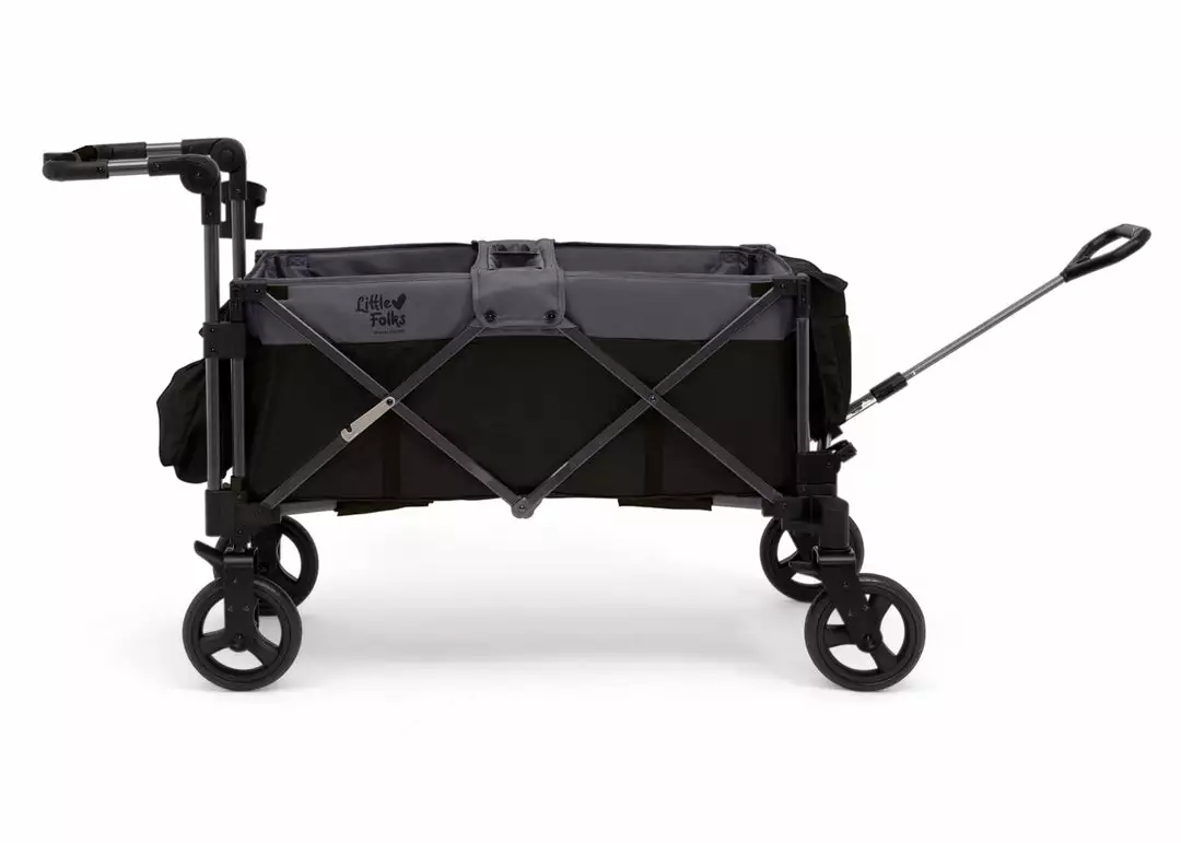 The Little Folks City Wagon Cruiser by Delta Children is specifically designed to grow and flow with your family. Packed with more features than a standard double stroller, this convenient wagon is perfect for indoor or outdoor activities. A comfy option for siblings or friends, this stroller wagon features two cushioned seats with 3-point safety harnesses for security while the removable center console with two cup holders and storage pocket allows kids to share snacks, toys and drinks. An additional cup holder for parents and side pockets ensure you can bring everything you need along for the adventure. The removable, UV blocking canopy and roll-down shades offer privacy and protection from the sun or rain. Easy to drive, it features swivel front wheels that allow you to effortlessly turn and pivot, as well as push and pull handles with adjustable heights. The wagon’s compact fold makes it easy to store or transport. And when your children outgrow the need for a wagon, use it to haul your own gear at the farmers market, while gardening or the grocery store. Holds up to 110 lbs. (55 lbs. per seat). Weighs 36.3 lbs. Recommended for ages 9 months up to 55 lbs.