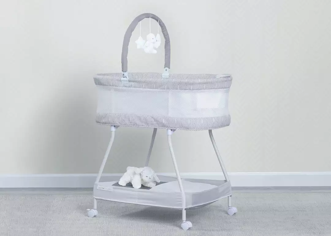 The Wave Bassinet by Delta Children is designed to help your little one fall asleep faster and stay asleep. This must-have bassinet features a control panel at the front with vibration, nightlight and soothing sounds to lull your newborn to sleep while mesh sides provide open airflow for breathability and a clear view of your baby. For your convenience, the adjustable toy bar provides entertainment if your baby wakes, lockable wheels make it easy to move around the house, and the easy-to-reach storage basket keeps changing essentials within reach. The Wave Bassinet by Delta Children is the easiest way stay safely connected and close to your baby during their first few months, and the modern wave print on the trim looks great in your master bedroom while room sharing or in your babyâs nursery. This bassinet is recommended for babies 0-5 months or up to 30lbs. Stop use at 5 months or once your infant begins to push up on their hands and knees, whichever comes first.