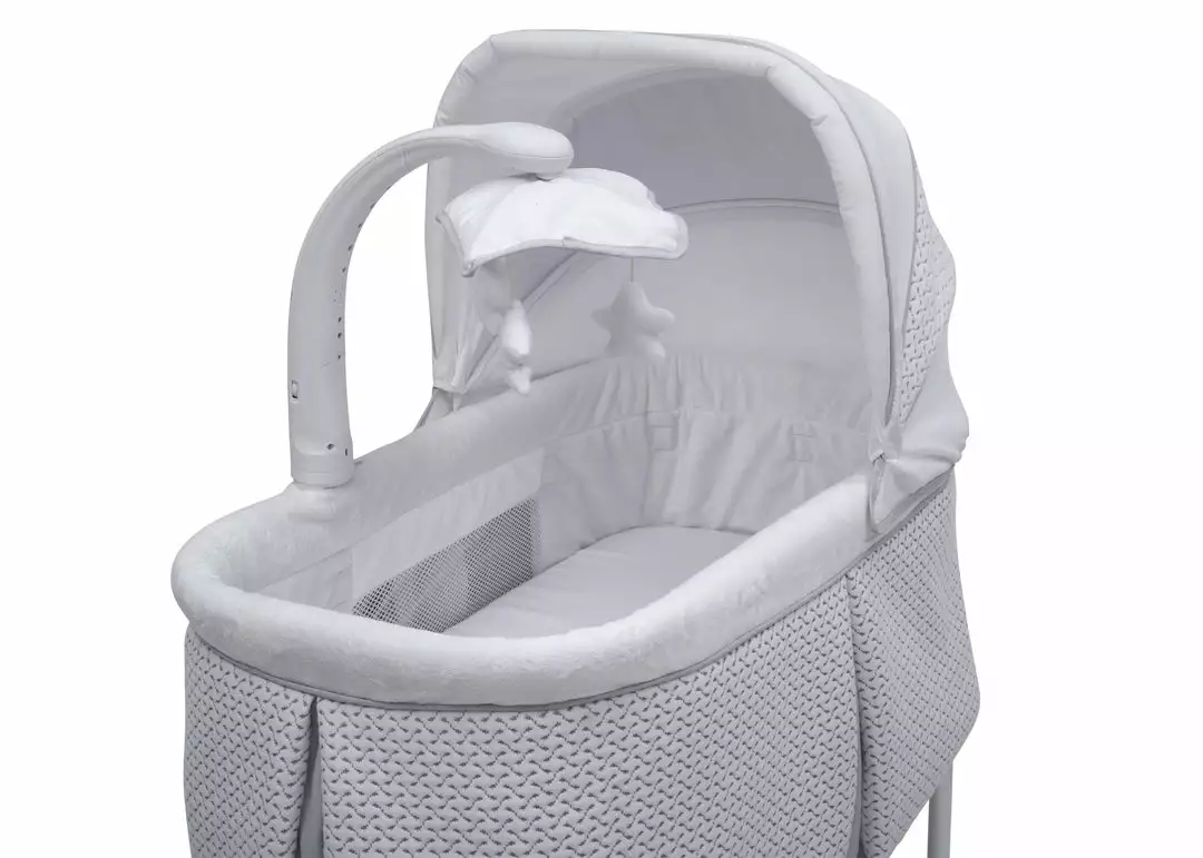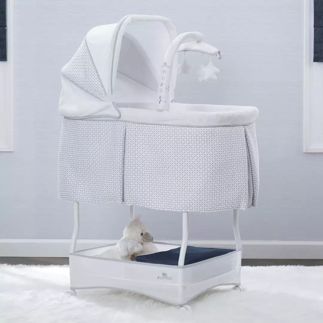Help ease your baby to sleep with the automatic gliding motion, soothing sounds, spinning star toys, twinkling lights and soft-glow nightlight on the Serta iComfort Auto Gliding Bassinet. Activate the bassinet’s whisper-quiet gliding motion with a push of a button—the smooth sway creates a serene sleep space. The modern grey and white pattern on plush fabrics will be at home anywhere, from the nursery to the family room and the parents’ bedroom. Locking wheels, a light blocking canopy and foam mattress pad means your newborn can sleep by your side, no matter where you are in the house. Plus, the removable fitted sheet is machine washable for easy care. Brought to you by Serta, the leader in mattress innovation and technology, this bassinet will make it easier than ever for baby to fall asleep and stay asleep throughout the night. This bassinet is recommended for babies 0-5 months. Stop use at 5 months or once your infant begins to push up on their hands and knees, whichever comes first. Use the included AC adapter for battery free operation.