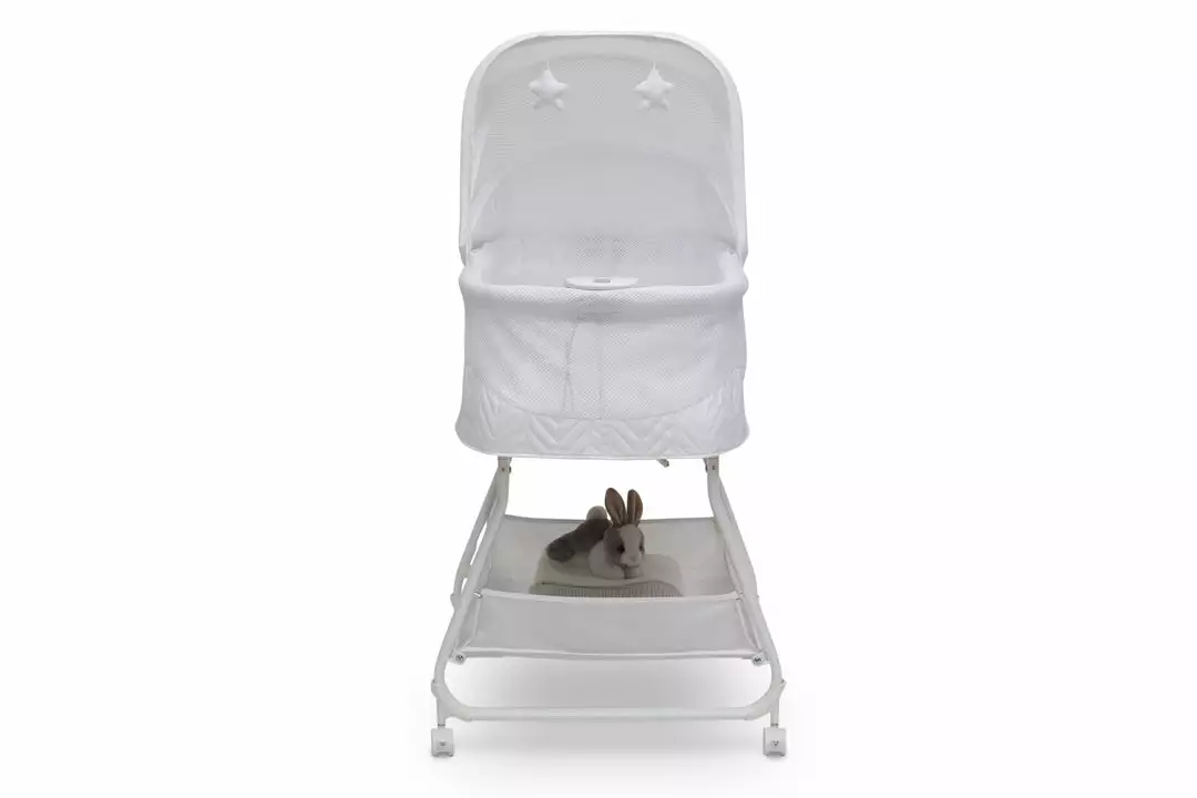 The Simmons Kids Airflow Auto Motion Bassinet is a modern close-to-the bed sleeper that boasts tons of calming and convenient features! Designed to help your baby fall asleep faster and stay asleep longer, the hands-free auto-glide motion helps soothe your babyâchoose from two speeds that run for 60-minute intervals. The attached electronic pod features a soft nightlight and eight music and sound options that you and your baby will love. Breathable mesh sides all around provide increased airflow and a clear view of your sleeping baby while the adjustable canopy blocks light during naptime. Hanging plush stars on the canopy will engage and delight your baby if they wake up in the middle of the night. Other stand-out features include: large storage basket, comfortable 1-inch waterproof mattress pad with machine washable fitted sheet and wheels that make it easy to move around the house. This bassinet is recommended for babies 0-5 months. Max weight 30 lbs. Stop use at 5 months or once your infant begins to push up on their hands and knees, whichever comes first.