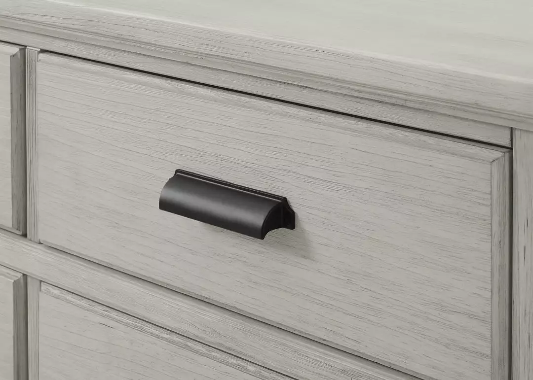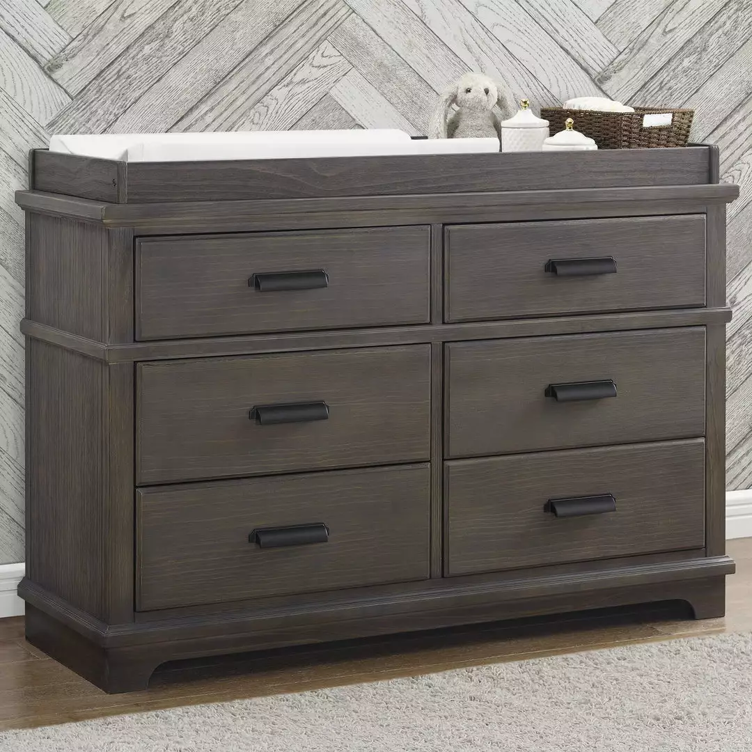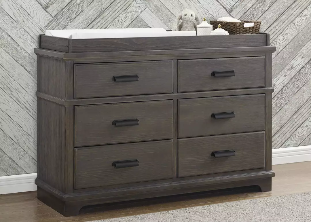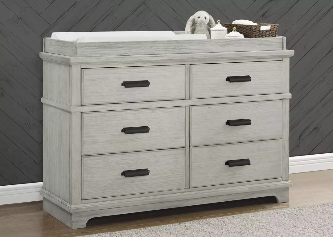 The Asher 6 Drawer Dresser with Changing Top by Simmons Kids adds modern farmhouse charm to any baby nursery or kids’ bedroom. A softy textured, hand applied finish and sleek matte black metal cup handles offer an updated take on rustic design. The Asher 6 Drawer Dresser includes a removable changing top that creates the perfect space for diaper changing now and is easily detachable, so you can create a more grown-up space later on. Pair this dresser with the Simmons Kids Asher 6-in-1 Convertible Crib for a coordinated look. Given the hand applied nature of this dresser’s finish, variations in the wood are to be expected and celebrated.