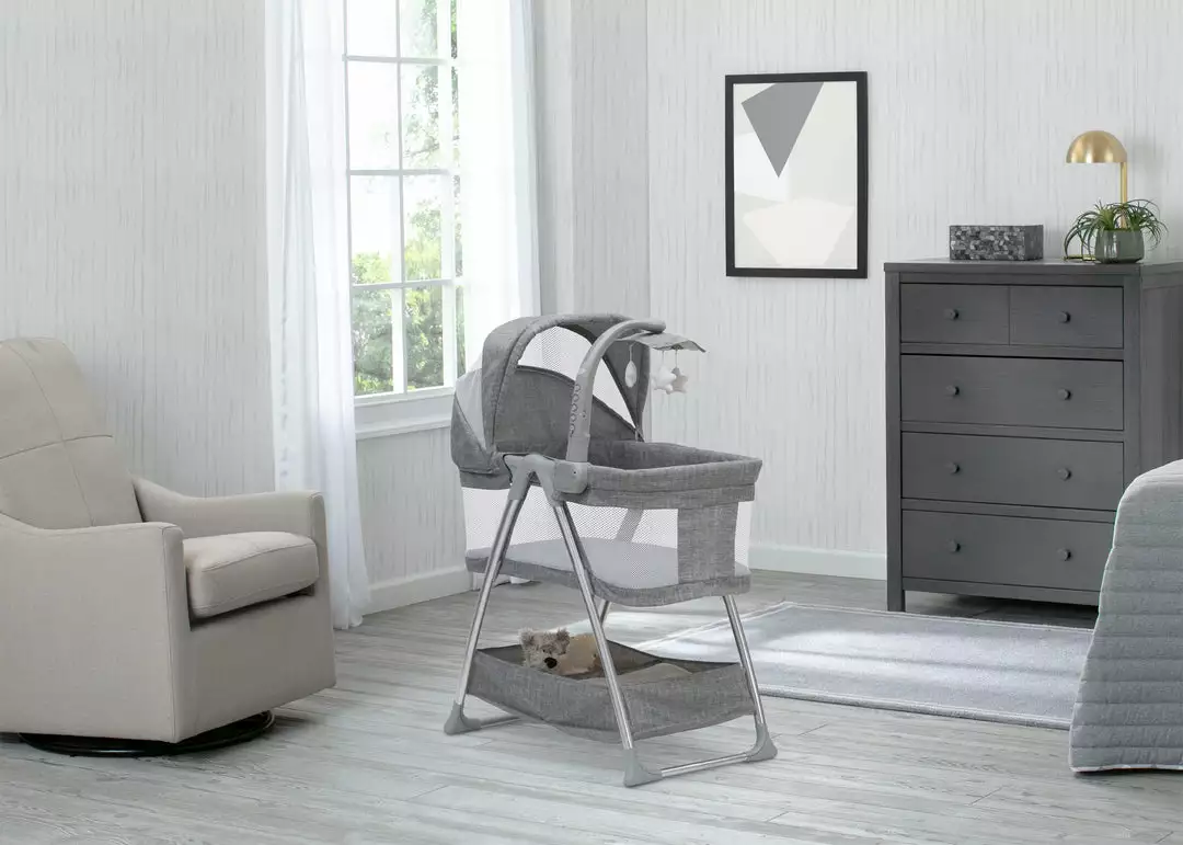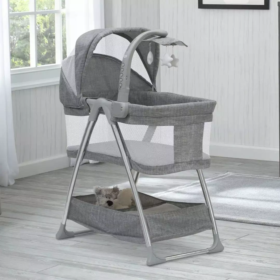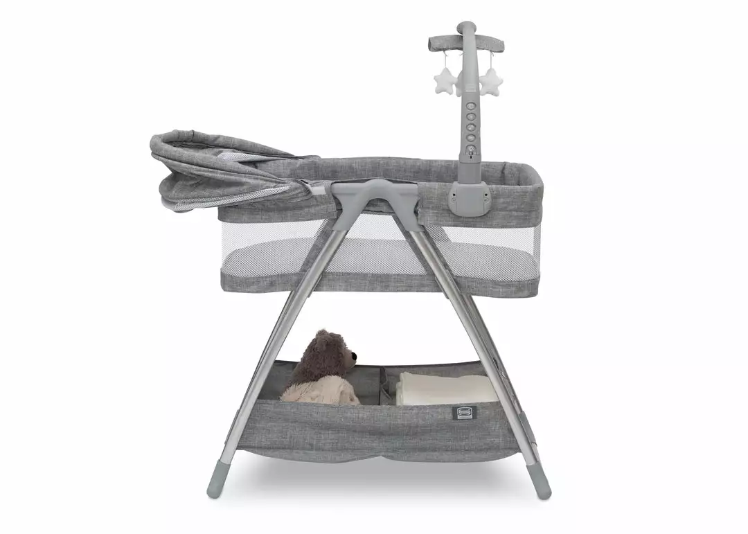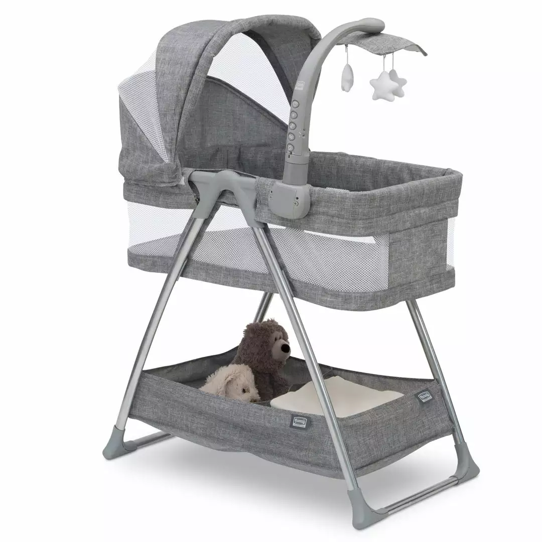 With a cool, contemporary style enhanced by high-tech features for your little trendsetter, the City Sleeper Bassinet by Simmons Kids is a perfect choice for your baby. A heathered grey tweed pattern adds a hip, stylish touch to this cozy infant bassinet. Providing a soothing sleep environment for baby, the sophisticated features of the attached electronic mobile include a nightlight, vibrations and twinkle lights to help lull your little one to sleep. Dangling plush stars that rotate add a dose of extra sweetness. Breathable mesh on the adjustable and removable canopy ensures healthy air flow and ventilation. A generously sized storage basket underneath the frame makes it easy to access all of your baby essentials. Your baby will sleep safe and sound, in style with the City Sleeper Bassinet.