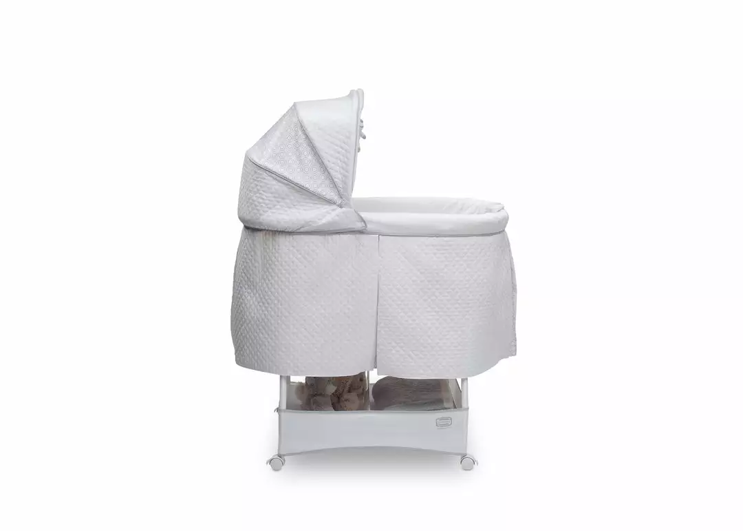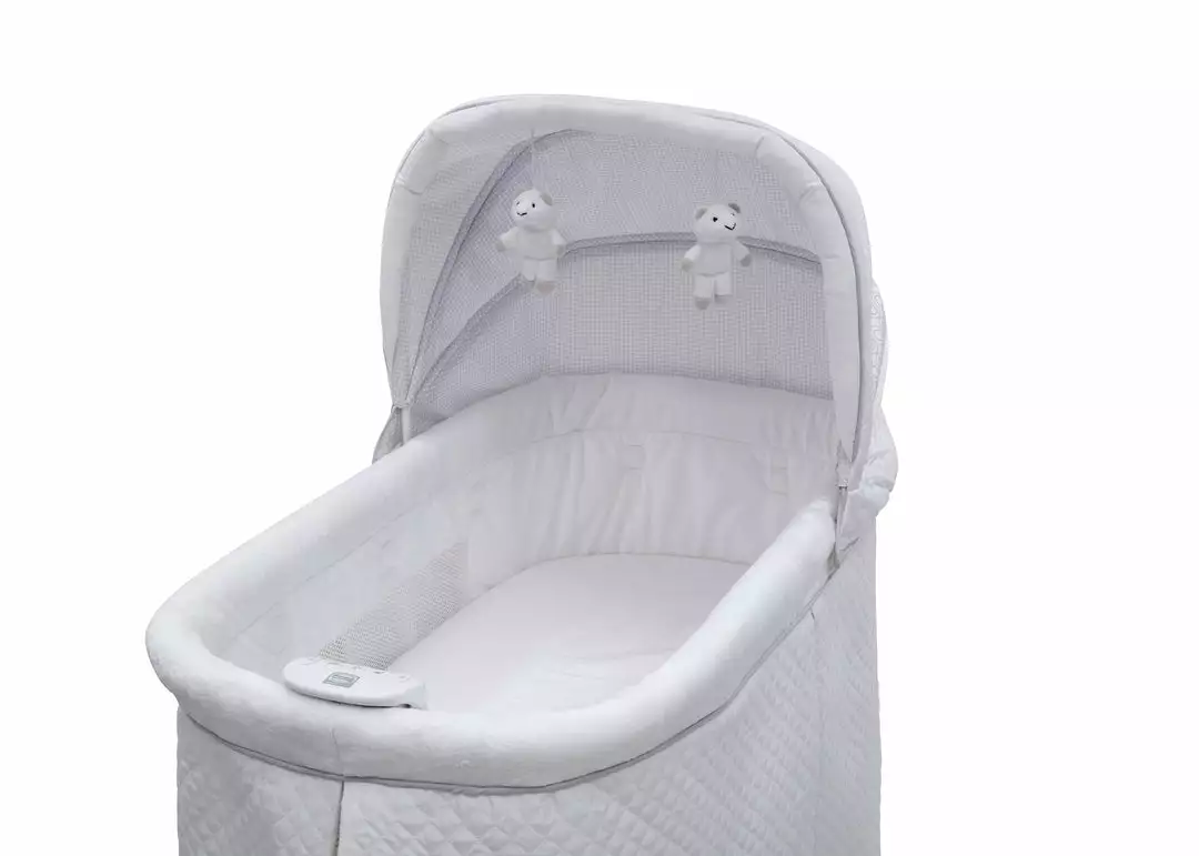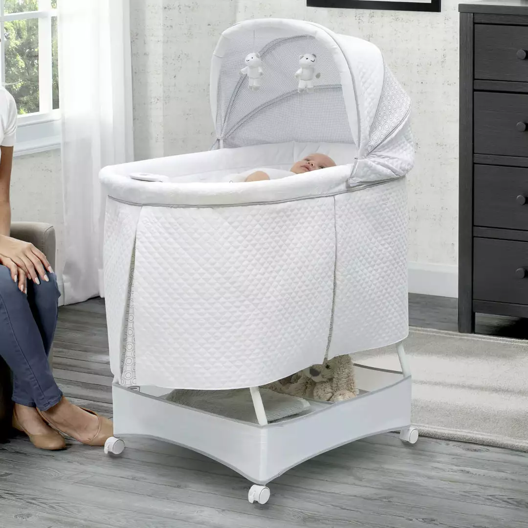 Lull your baby to sleep with the relaxing, automatic gliding movement of the Beautyrest™ Silent Auto Gliding Lux Bassinet. With a push of a button, the bassinet’s whisper-quiet gliding motion is activated, and the smooth sway of the bassinet will help your newborn drift to sleep peacefully. Outfitted with other electronic features that’ll help Baby power down, this bassinet comes outfitted with preloaded lullabies and sounds, as well as a nightlight—it has everything you need to effortlessly tackle bedtime with your newborn. Built with locking wheels and a lightweight frame to make it easy to move from room to room, this bassinet ensures your little one will have a safe spot to rest in any room of the house—it’s ideal for bedtime or daytime naps, since the adjustable canopy allows you to block light in order to create a serene sleep space anywhere and anytime.