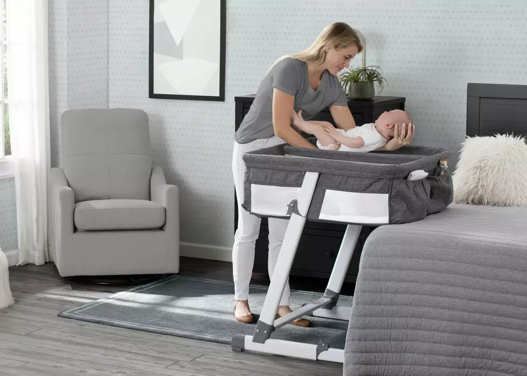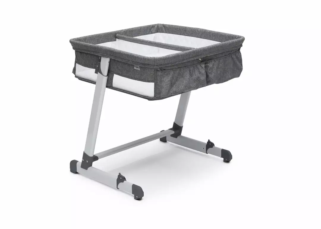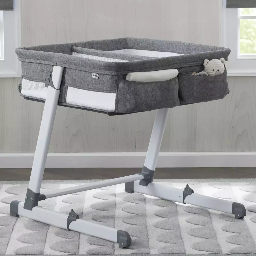 Keep your newborn twins close with the Simmons Kids By the Bed Twin City Sleeper Bassinet. The bassinetâs modern z-shaped frame is outfitted with wheels, so you can easily slide the base under your bed giving your babies a safe, separate sleep space thatâs still close to you (and each other!). Perfect for all mothers (especially those who are breast feeding or recovering from C-sections), this bassinetâs sturdy, adjustable base with five height levels fits next to almost any bed, and keeps your baby at eye level, so you can easily soothe and tend to them during their first few months. Mesh sides provide a clear view and help with airflow. For your ease, storage pockets provide space for burp clothes, small toys or pacifiers. The twin bedside sleeper of your dreams, the Simmons Kids By the Bed Twin City Sleeper Bassinet allows you to feel close and connected to your little ones in the safest way possible. This bassinet is recommended for babies 0-5 months. Stop use at 5 months or once your infant begins to push up on their hands and knees, whichever comes first.