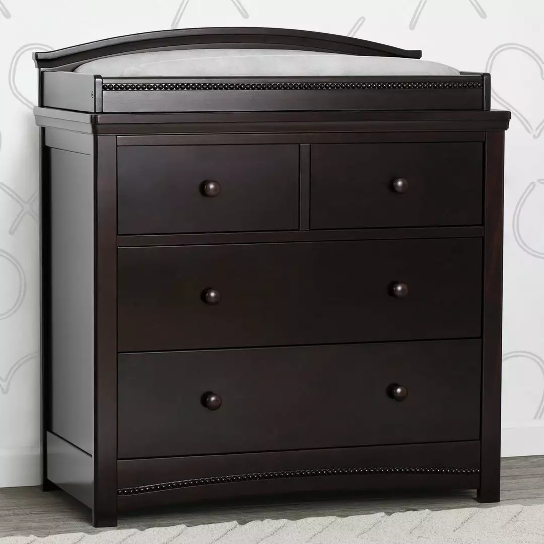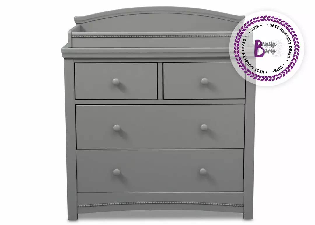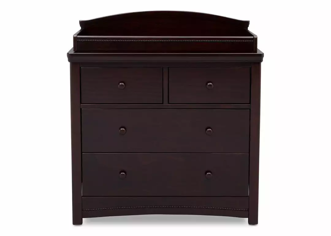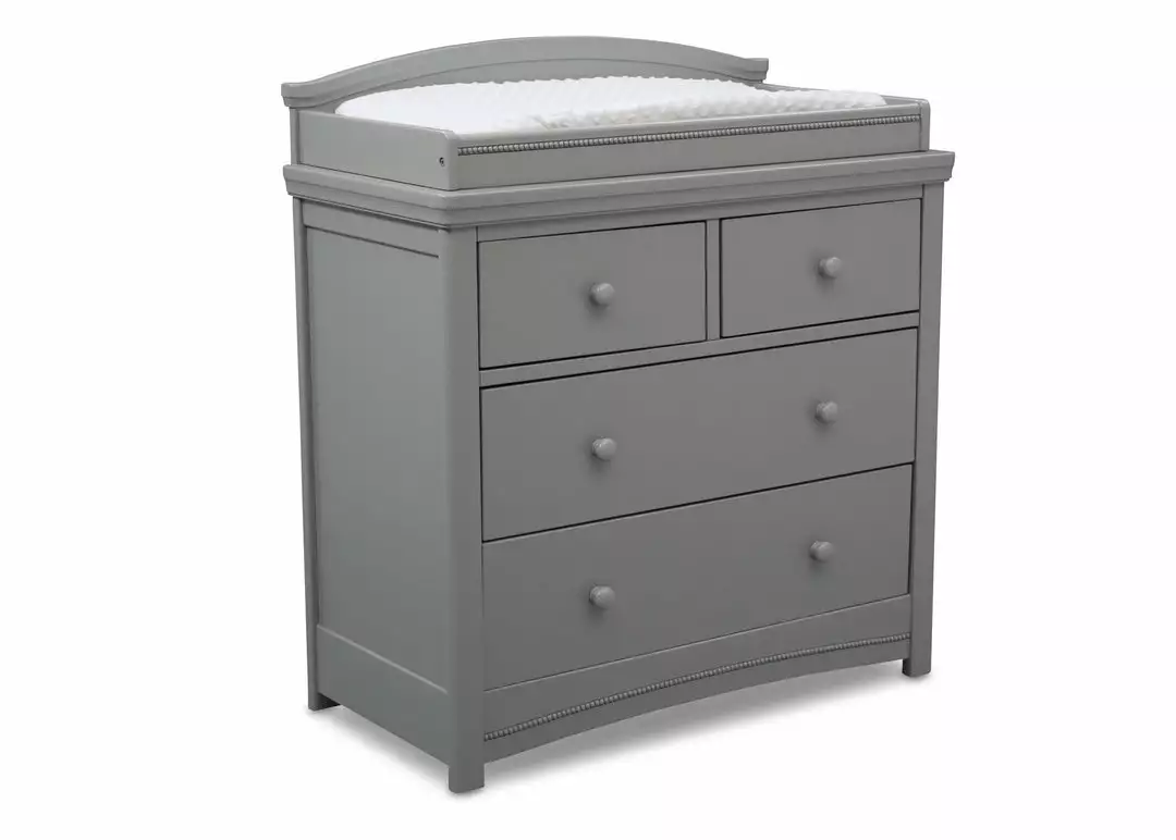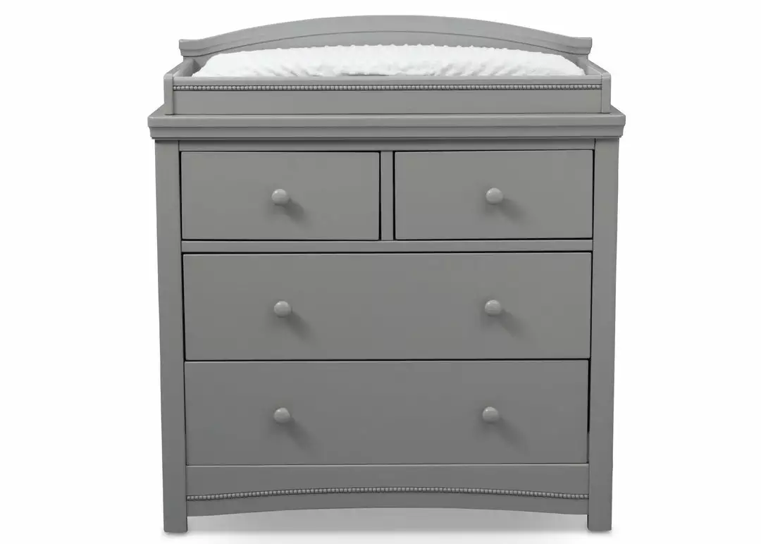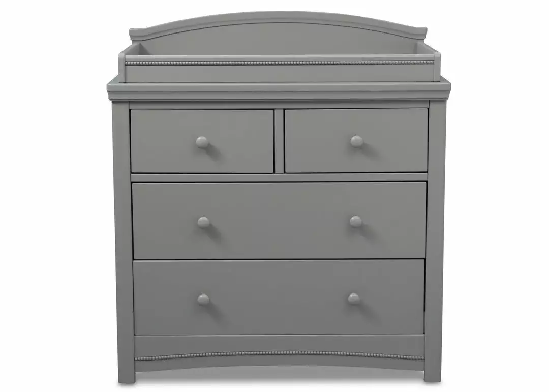 Endlessly useful and extra sturdy, the Emma 4 Drawer Dresser with Changing Top is a smart and stylish storage option for your nursery. Ample storage space keeps growing wardrobes organized while the removable topper makes changing time easy. Pretty details and smart safety features mean that this dresser will be a fixture in your child’s room for years to come