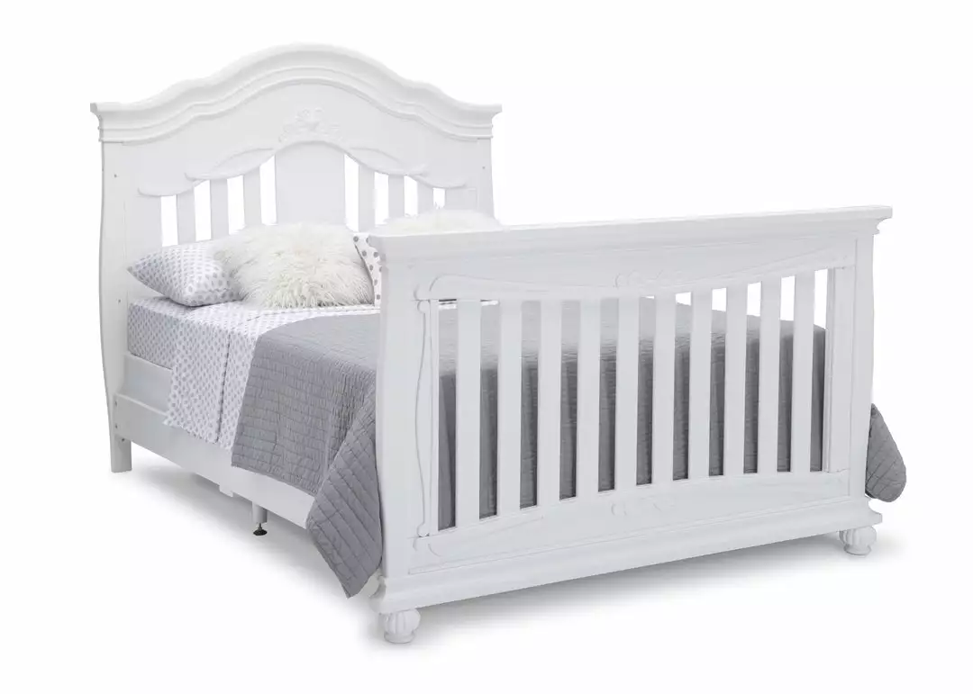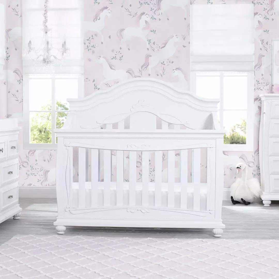 Give your nursery the royal treatment with the Fairytale 5-in-1 Convertible Crib with Conversion Rails by Simmons Kids. Full of enchanting details, like a scalloped silhouette, intricate princess-inspired carvings and bun feet, this baby crib adds sophisticated style to any bedroom. Designed to grow with your little princess, it features three adjustable mattress positions, and (magically!) transforms into a toddler bed, daybed, sofa and full size bed. For your convenience, all of the conversion rails are included with this crib which easily allows you to adapt to each stage of your childâs life. To complete your nursery, pair the Fairytale 5-in-1 Convertible Crib with coordinating items from the Simmons Kids Fairytale Collection.