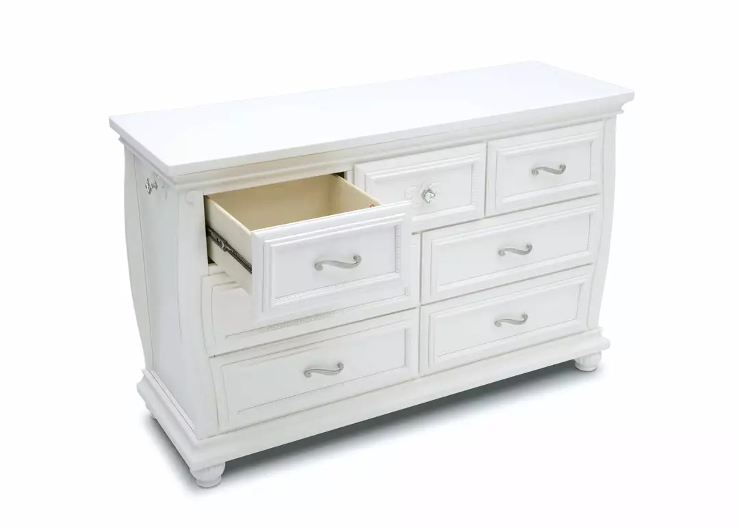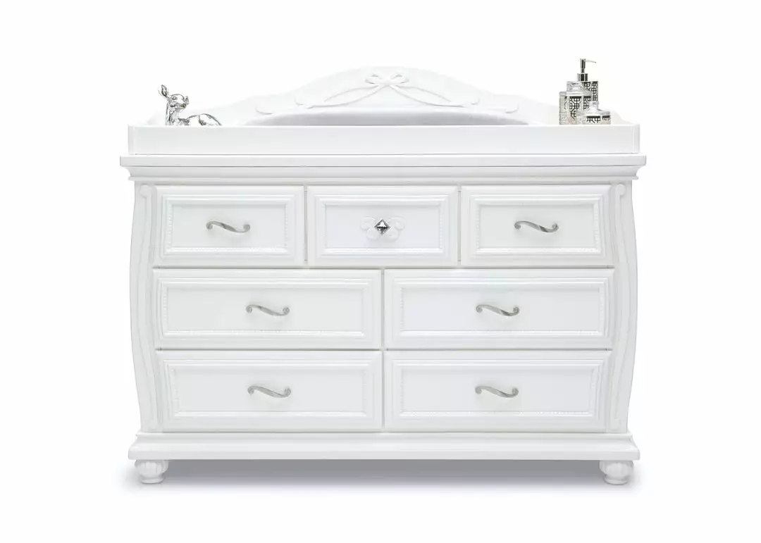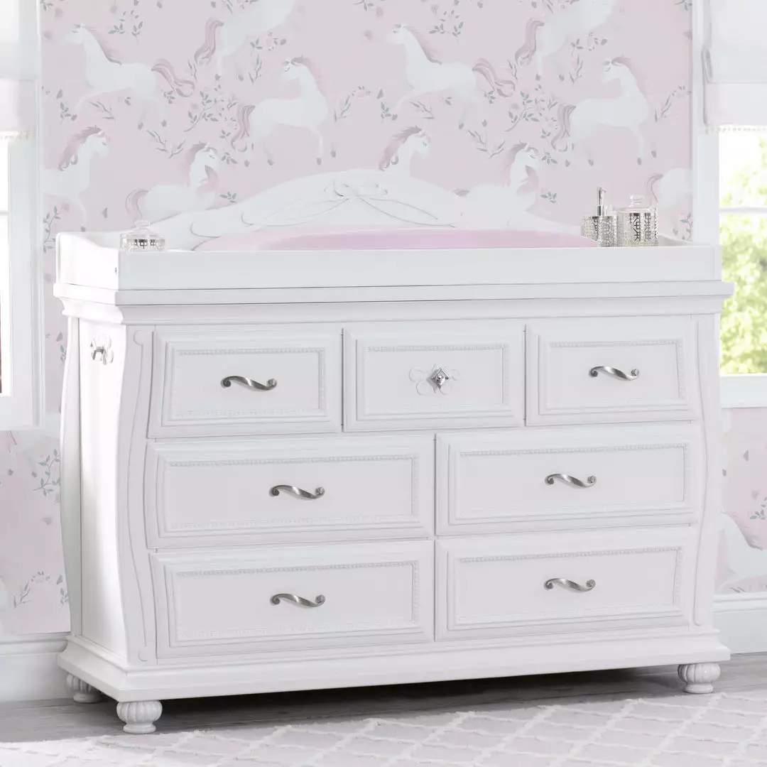 The Fairytale 7 Drawer Dresser with Changing Top will be the crown jewel of any bedroom. Seven sliding drawers with satin nickel pulls open to reveal a wealth of storage within. Acrylic knobs on each side of the dresser provide additional storage space to hang changing accessories, like towels or burp clothes. The included changing top provides a convenient and safe place to dress or change your baby’s diapers—and its felt lined bottom protects the dresser’s surface. Remove the changing top once your child outgrows the needs for a changing table