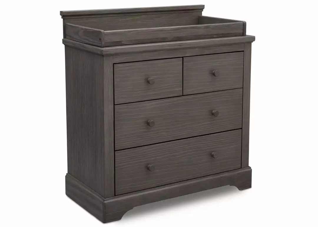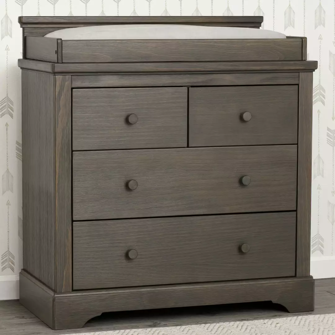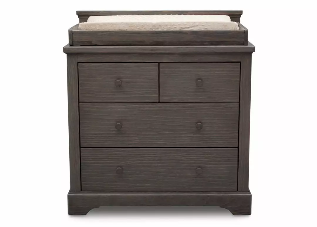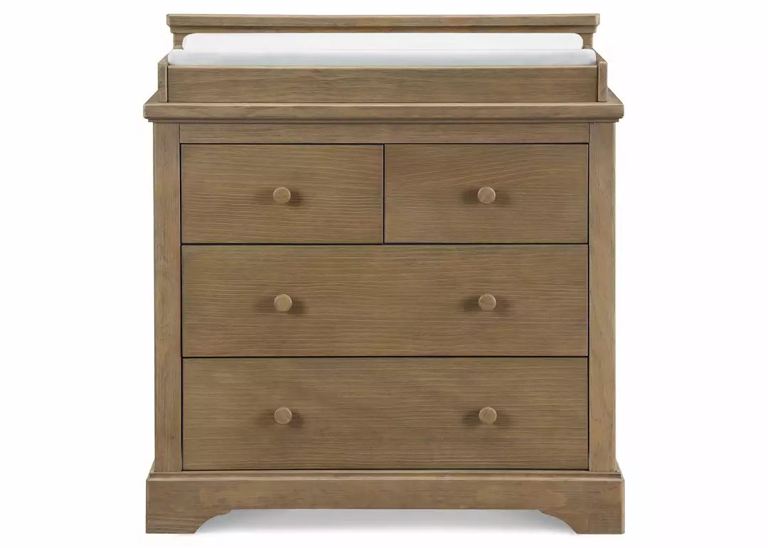 Impressive and substantial, the Paloma 4 Drawer Dresser with Changing Top from Simmons Kids instantly brings warmth to any space. Gorgeously made from strong and sturdy pine, this dresser features a hand-distressed, soft textured finish that makes each piece one of a kind. Built to accommodate your childâ needs, this rustic dresser features a removable changing topper, plus it has two large drawers and two smaller drawers to house all their clothes and accessories. Pair it with the Paloma 4-in-1 Crib (sold separately) to complete your nursery.