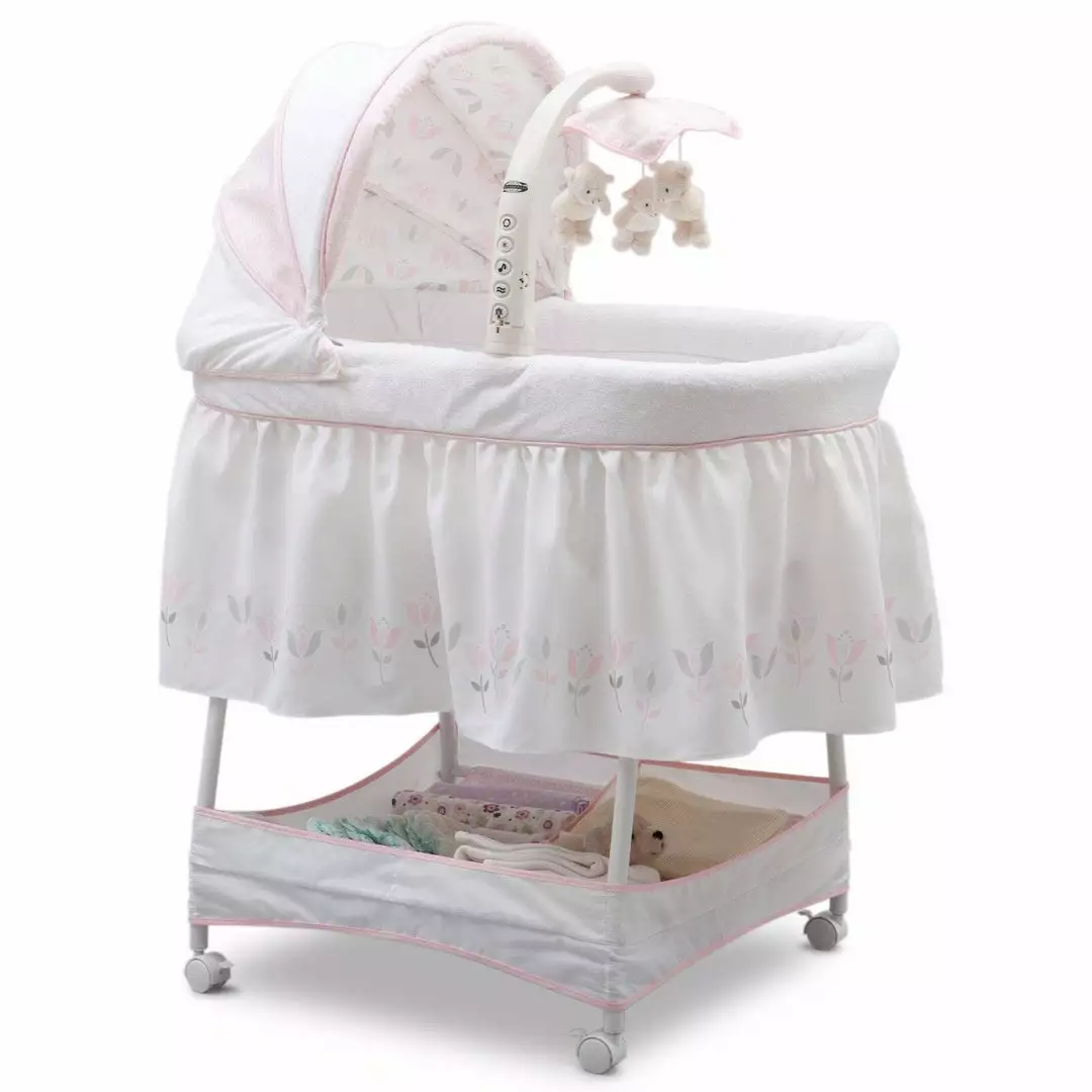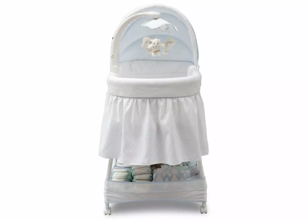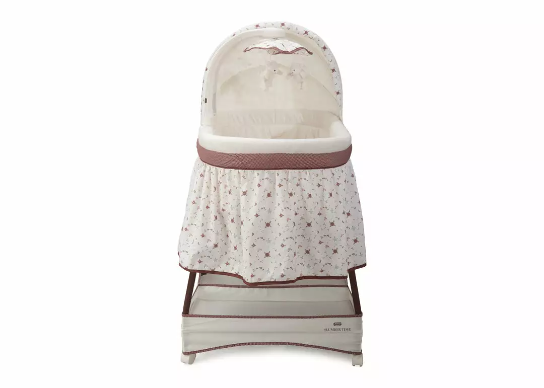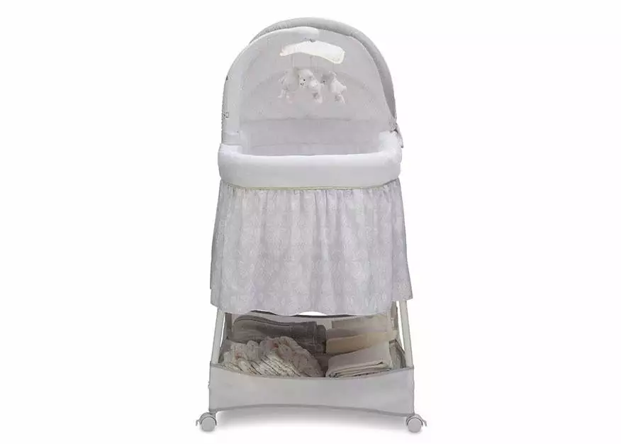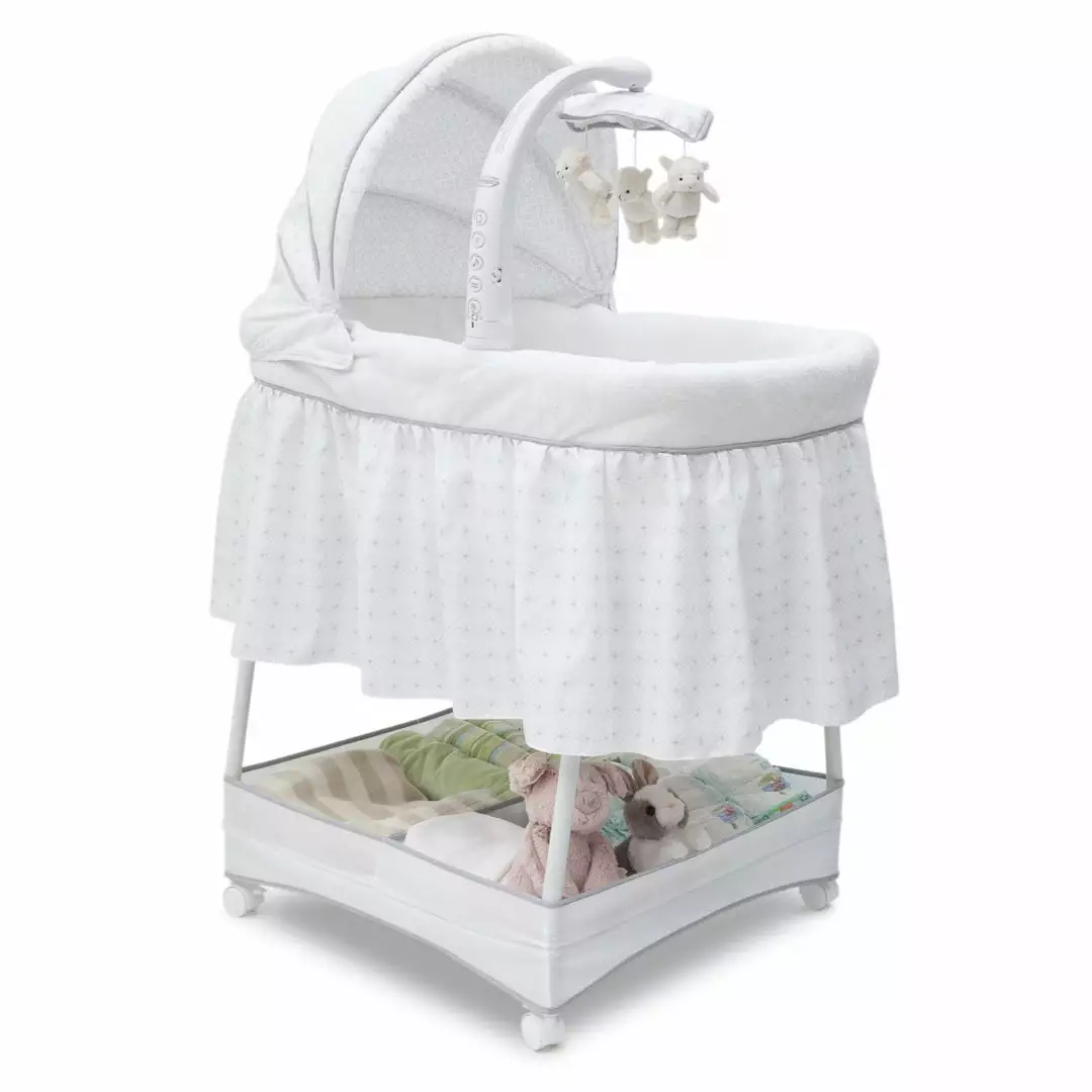 Keep your baby close in the safest way with Simmons Kids® Slumber Time Elite Gliding Bassinet! Outfitted with a soothing side-to-side rocking motion and an electronic mobile that lulls little ones to sleep, this cozy bassinet also features spinning lamb toys, variable speed vibration, calming nightlight, relaxing music and a storage basket underneath.