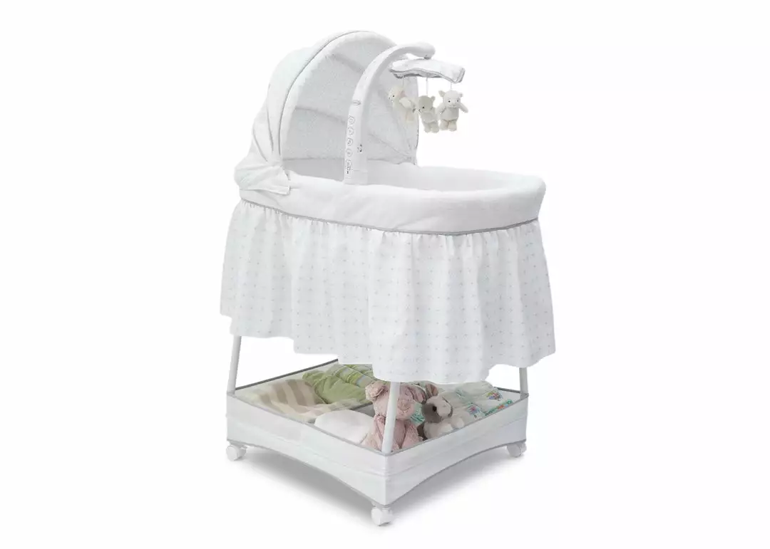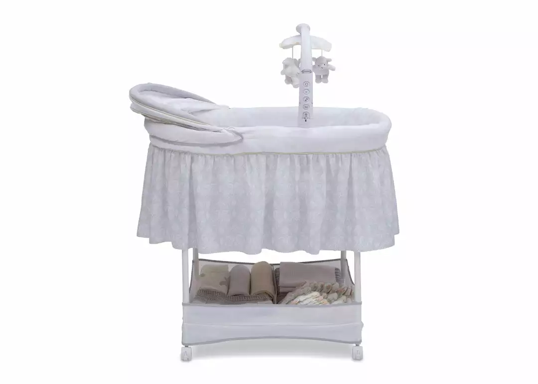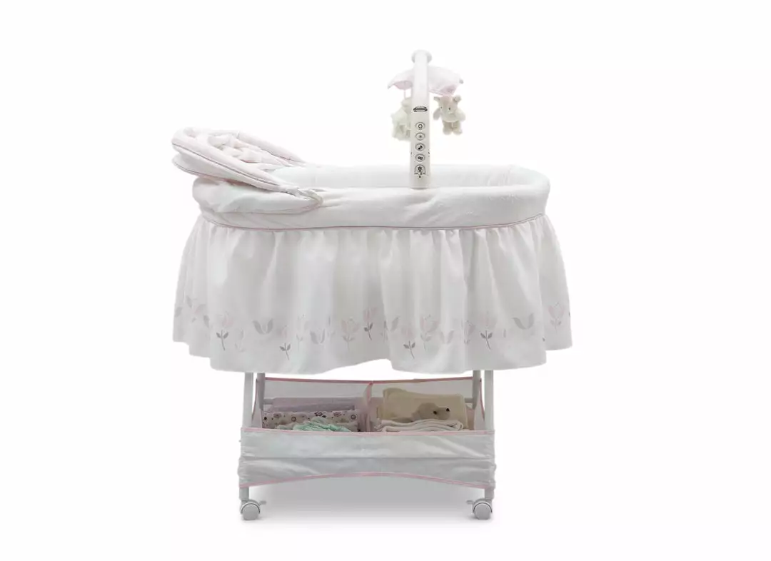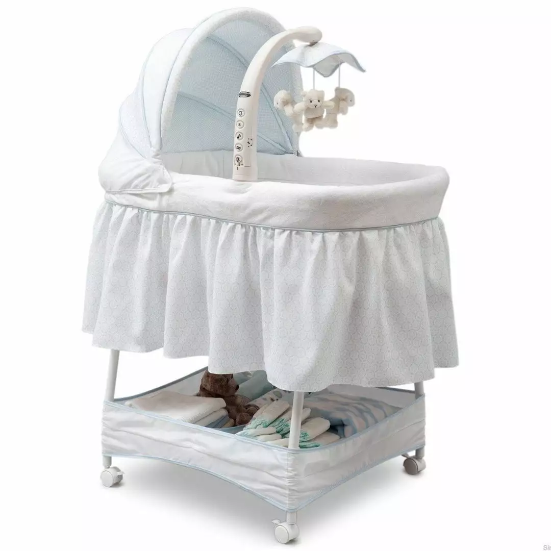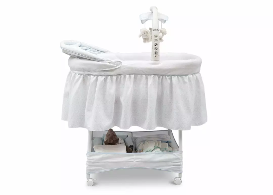 Keep your baby close in the safest way with Simmons Kids® Slumber Time Elite Gliding Bassinet! Outfitted with a soothing side-to-side rocking motion and an electronic mobile that lulls little ones to sleep, this cozy bassinet also features spinning lamb toys, variable speed vibration, calming nightlight, relaxing music and a storage basket underneath.