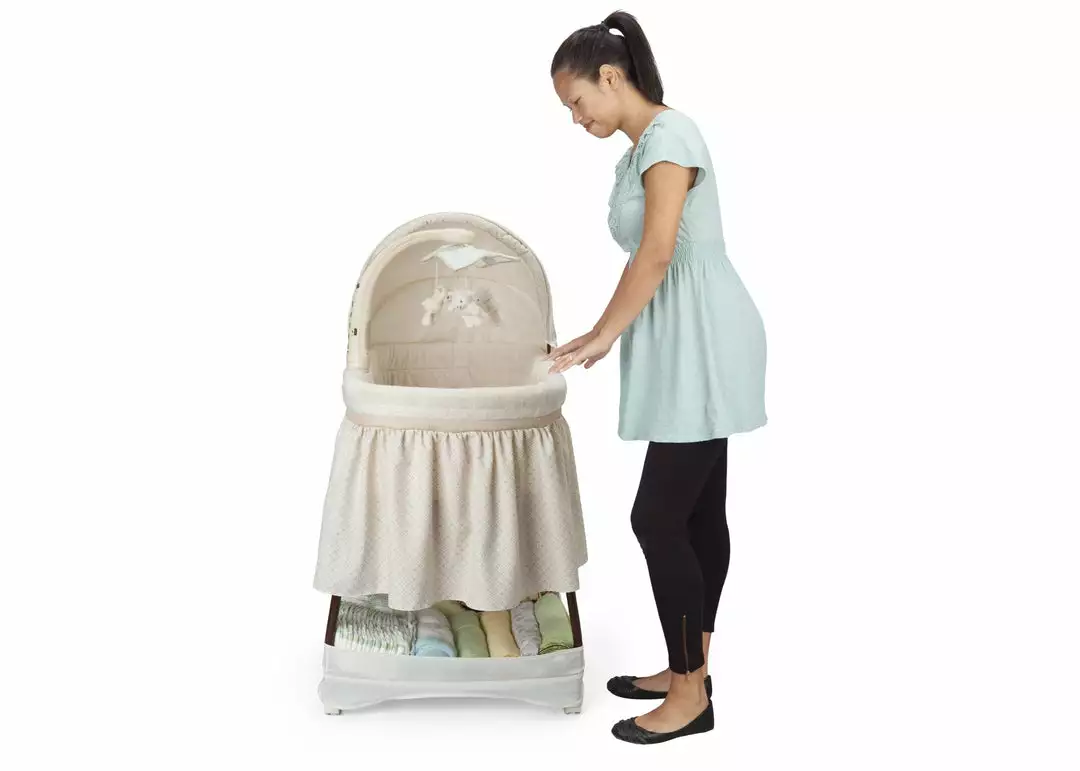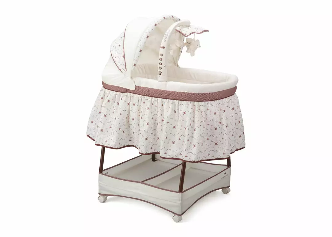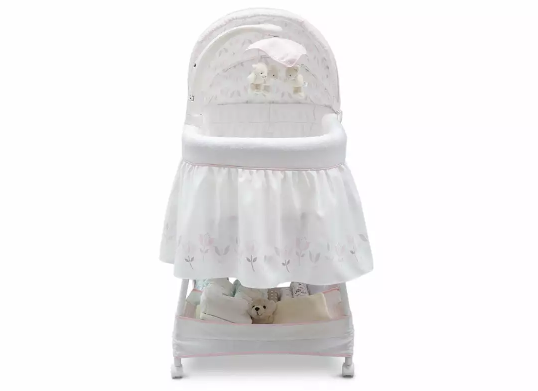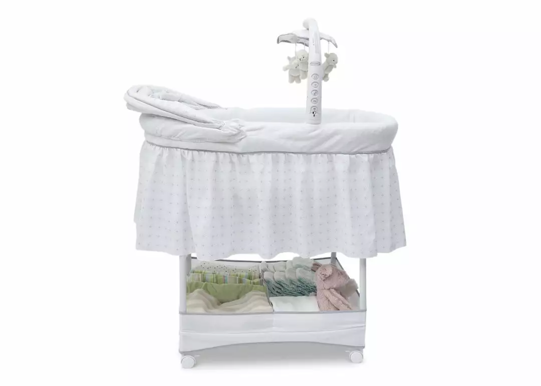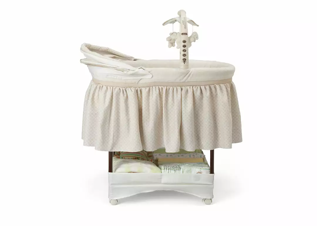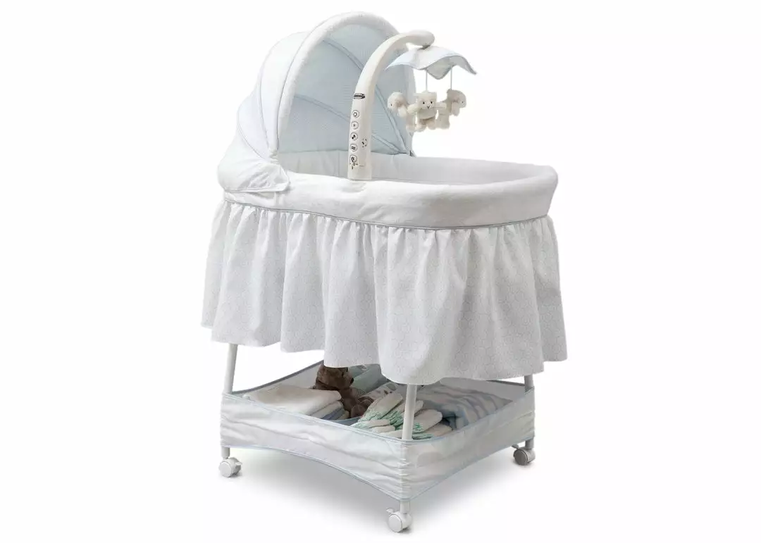 Keep your baby close in the safest way with Simmons Kids® Slumber Time Elite Gliding Bassinet! Outfitted with a soothing side-to-side rocking motion and an electronic mobile that lulls little ones to sleep, this cozy bassinet also features spinning lamb toys, variable speed vibration, calming nightlight, relaxing music and a storage basket underneath.