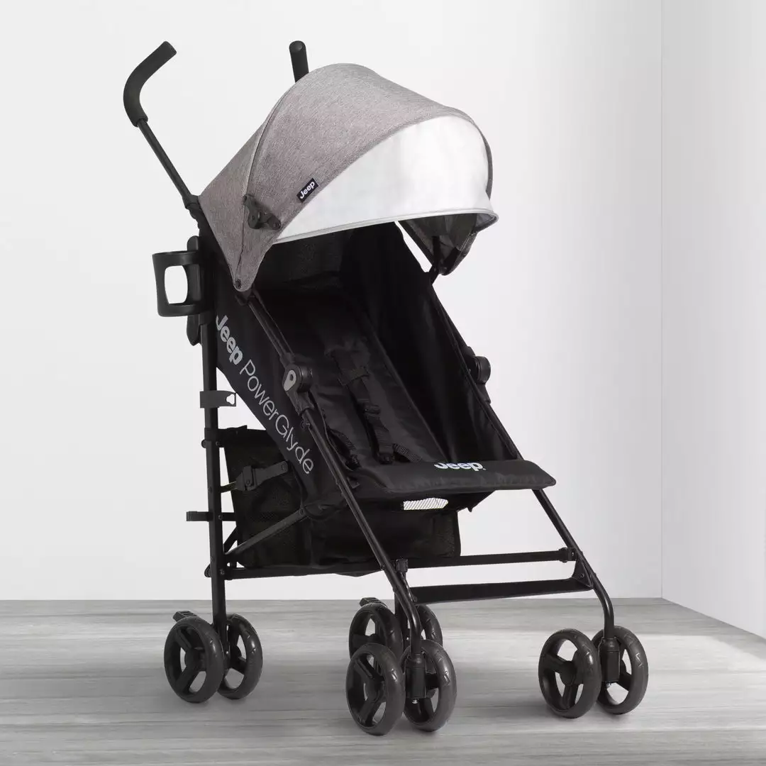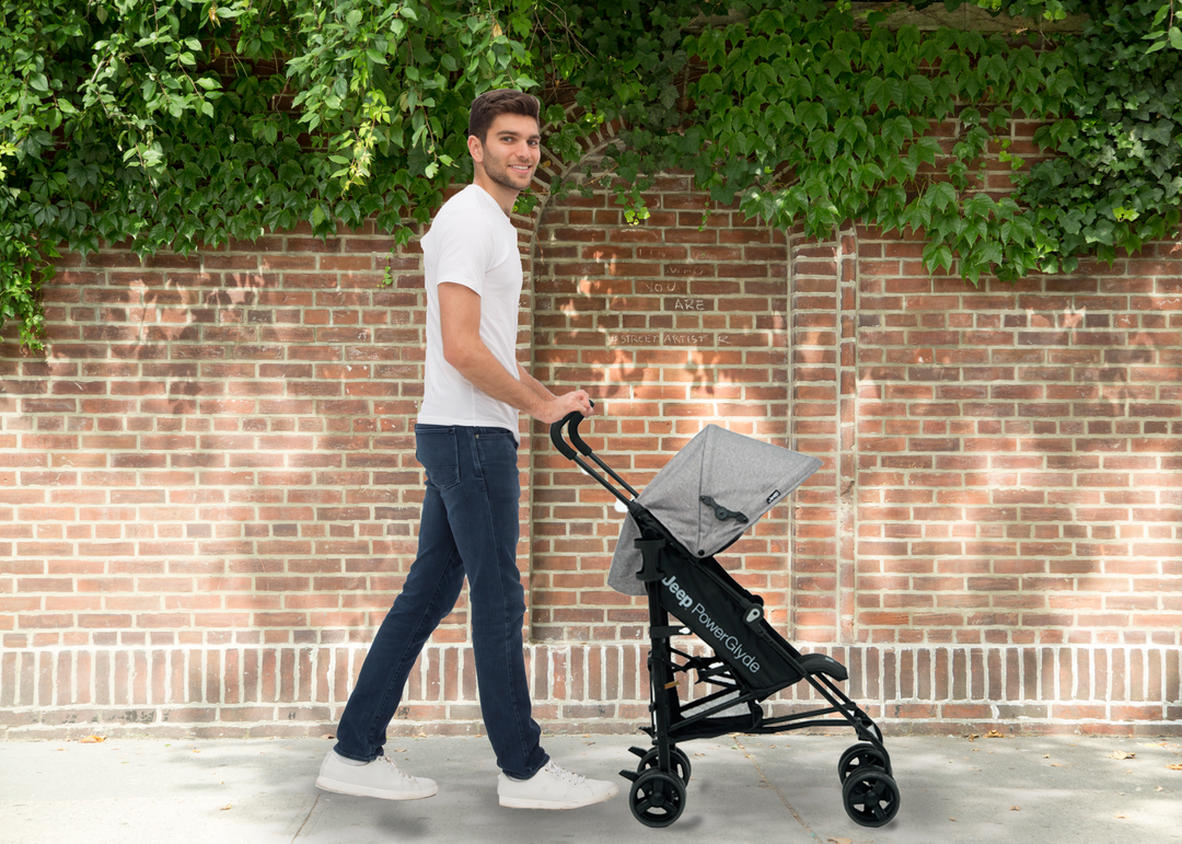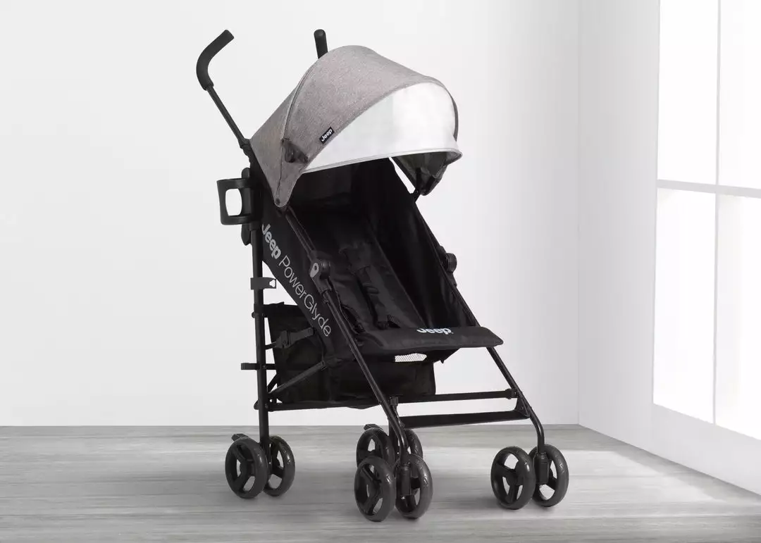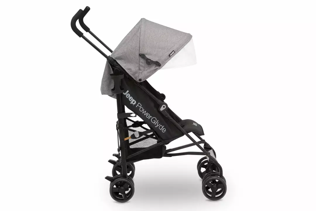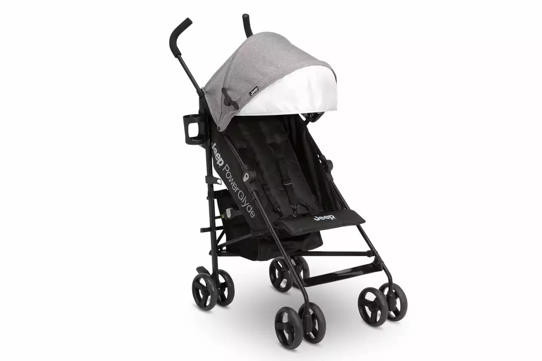 Wherever the road takes you, the Jeep PowerGlyde Stroller by Delta Children will deliver the best ride ever. The Jeep PowerGlyde offers the most advanced handling thanks to all-new front wheels that feature precision technology, making it easier than ever to glide, turn and maneuver any surface. Ideal for travel or everyday use, this lightweight stroller with a durable steel frame weighs under 14 pounds and features a compact umbrella fold with an auto lock design and carry handle. An extra-large extendable canopy with UPF 50+ sun visor will protect your child from the elements and a three-position reclining seat ensures baby is comfortable during walks, near and far. Some additional features of this lightweight stroller include: five-point safety harness, extra-large storage basket, parent cup holder and swivel front wheels. This stroller is recommended for infants 9 months up to 50 pounds. Let’s glyde!