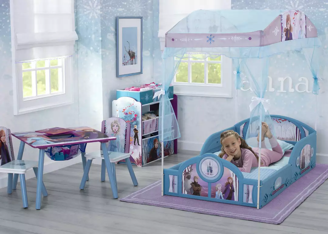 This Disney Frozen II Plastic Sleep and Play Toddler Bed with Canopy by Delta Children is too cool for words! Designed with a touch of fantasy that will cause a flurry of excitement, your child will love tucking into this bed each and every night. The bed’s low mattress height, attached guardrails, sheer organza canopy and colorful graphics of Anna, Elsa, Kristoff and Olaf make it the best option for your child’s first big-kid bed—it gives them the independence they crave while keeping them safe throughout the night. And that’s not all, the bed’s versatile plastic frame can also be used as a play enclosure or a ton of other fun things, like a ball pit (play balls not included). Get this toddler canopy bed today and bring home the magic of Frozen!